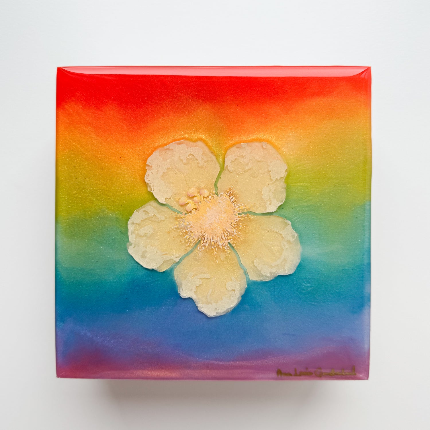 The Aloha Rainbow piece was inspired by the vibrant skies of Hawaiʻi and the magical rainbows that so often appear after a passing rain. With its colorful, radiant background and a delicate golden-yellow hibiscus, this piece is a gentle reminder of the Aloha spirit—of joy, resilience, and finding beauty even after the storm.