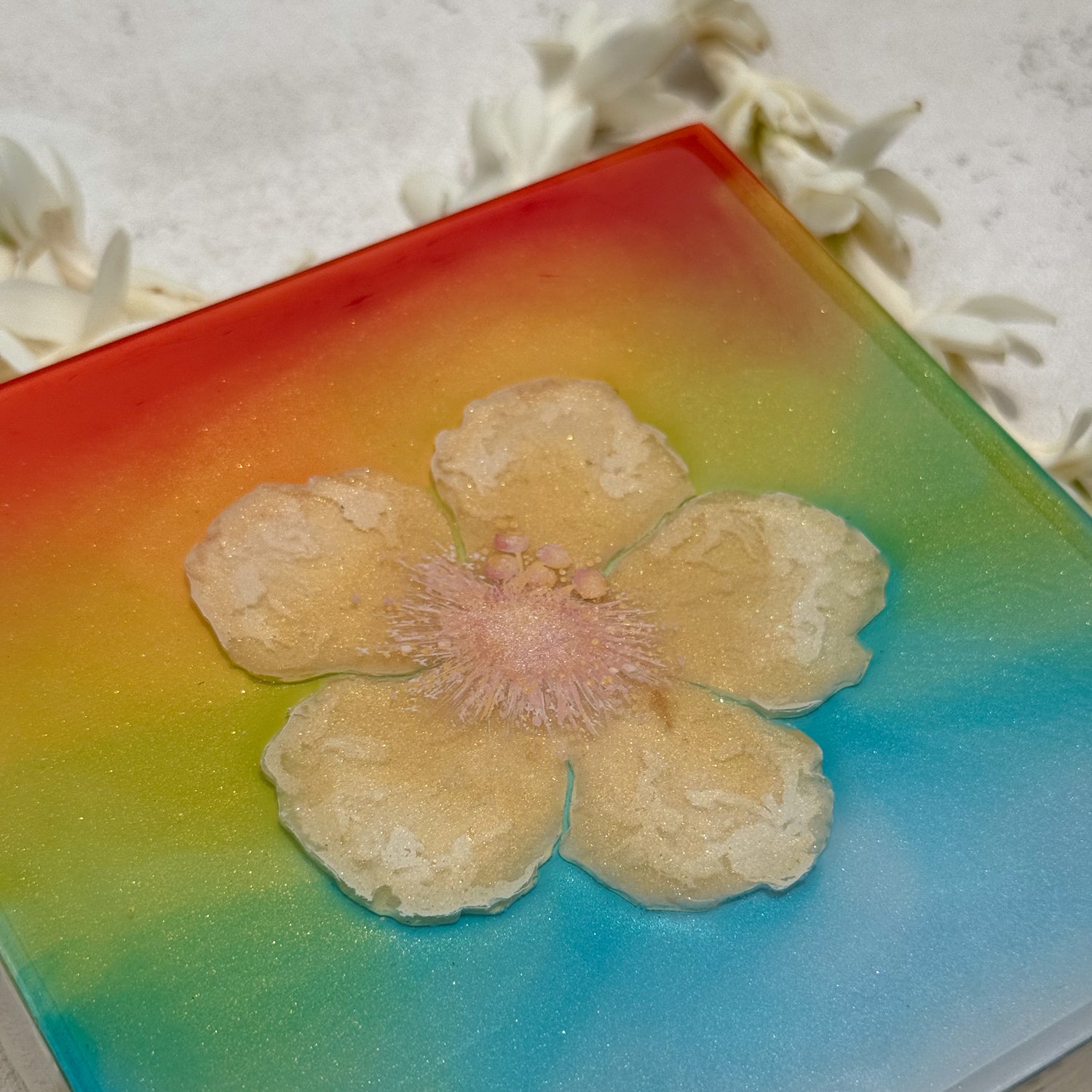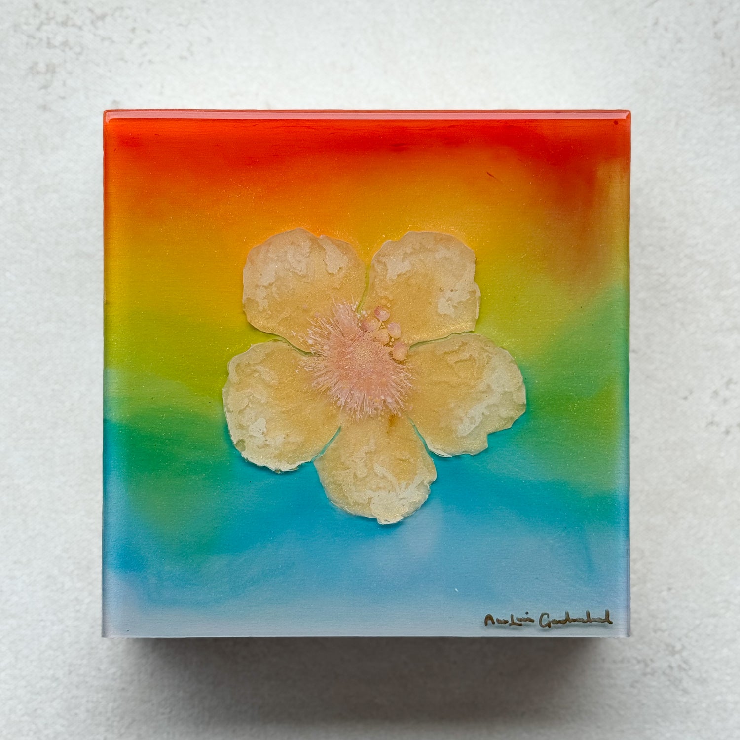 The Aloha Rainbow piece was inspired by the vibrant skies of Hawaiʻi and the magical rainbows that so often appear after a passing rain. With its colorful, radiant background and a delicate golden-yellow hibiscus, this piece is a gentle reminder of the Aloha spirit—of joy, resilience, and finding beauty even after the storm.