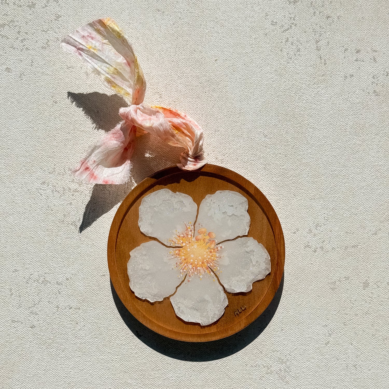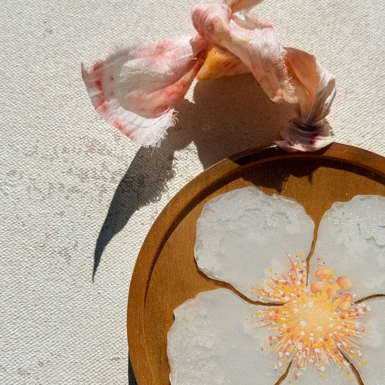 Ana Lucia poured resin coats with pure pigments to cover the piece and try to capture the fluid movements of the vibrant colors within the hibiscus. Each flower is uniquely detailed with acrylic paint. The colorful strokes of paint give a different essence to each flower.