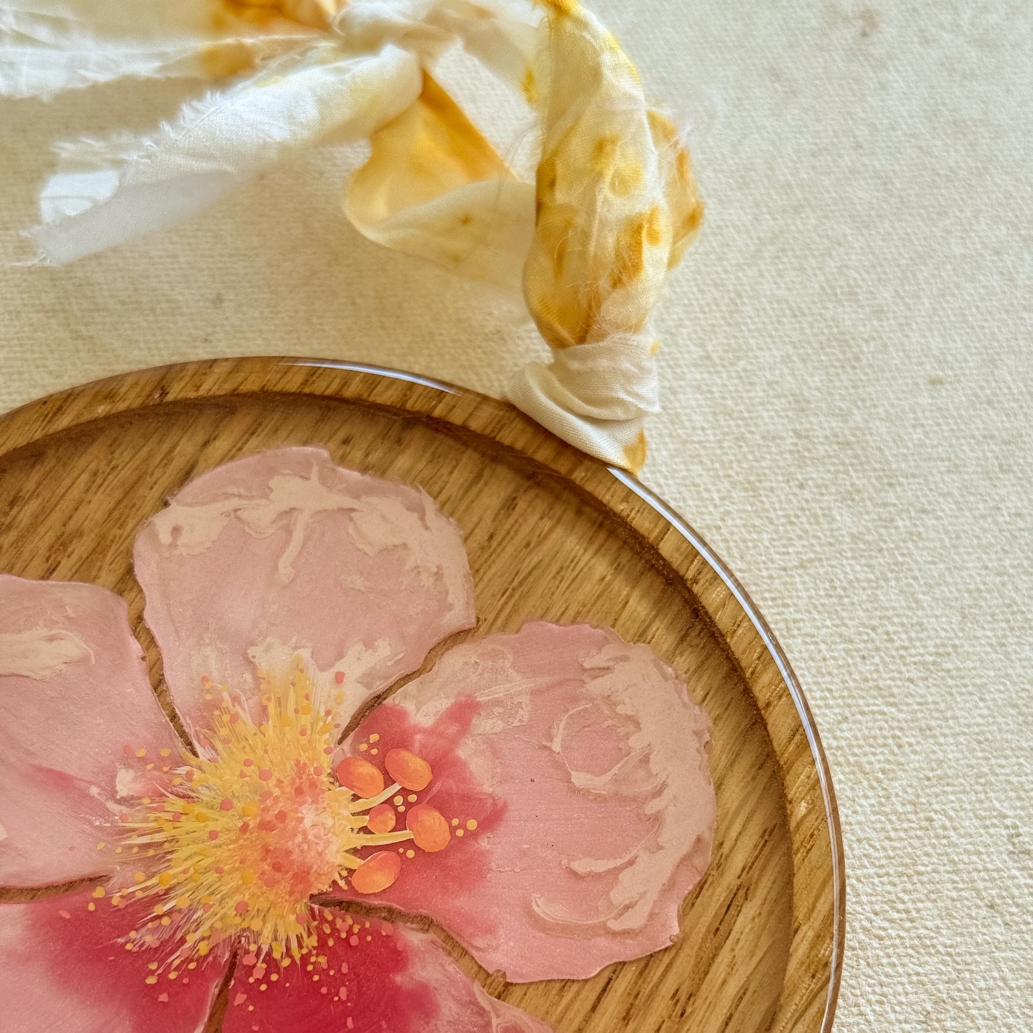 Ana Lucia poured resin coats with pure pigments to cover the piece and try to capture the fluid movements of the vibrant colors within the hibiscus. Each flower is uniquely detailed with acrylic paint. The colorful strokes of paint give a different essence to each flower.
