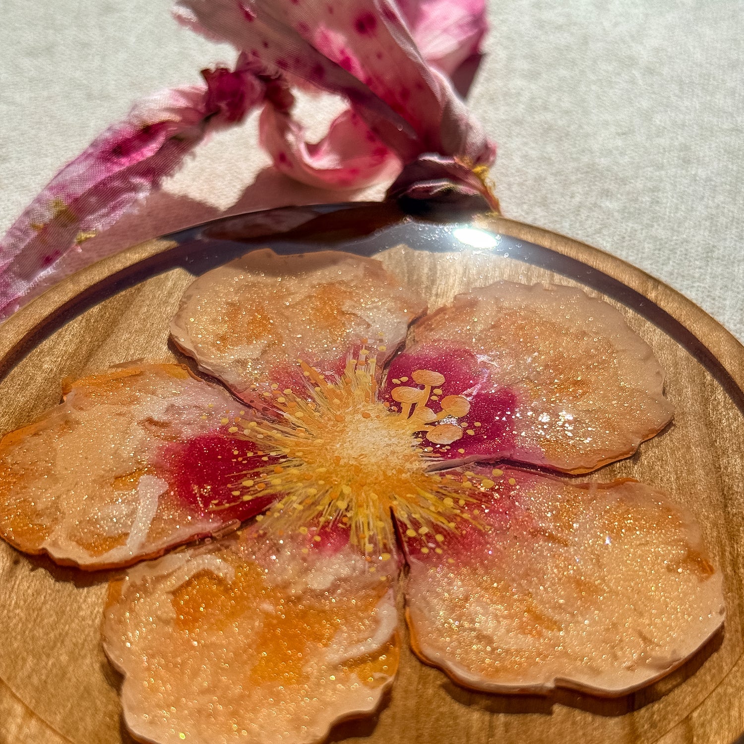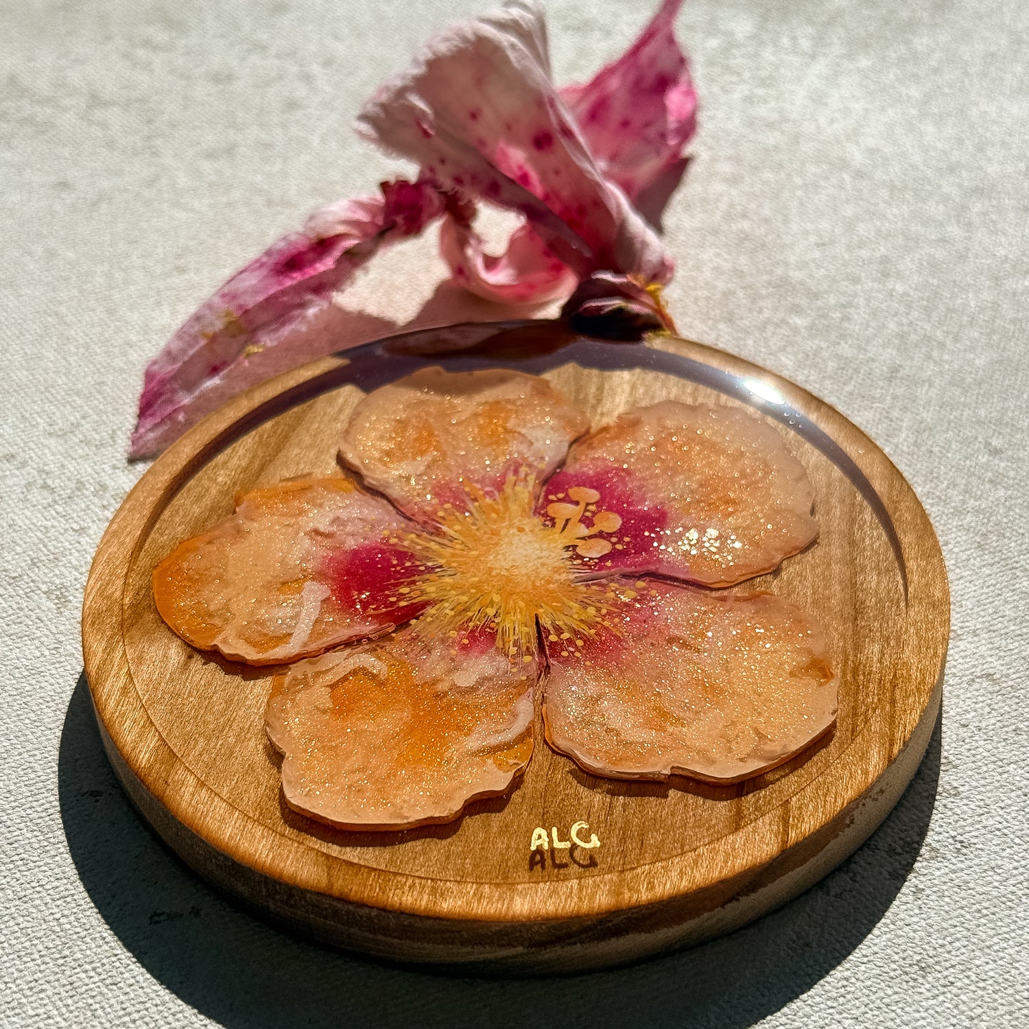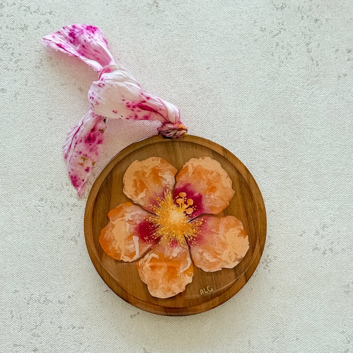 Ana Lucia poured resin coats with pure pigments to cover the piece and try to capture the fluid movements of the vibrant colors within the hibiscus. Each flower is uniquely detailed with acrylic paintThe colorful strokes of paint give a different essence to each flower.