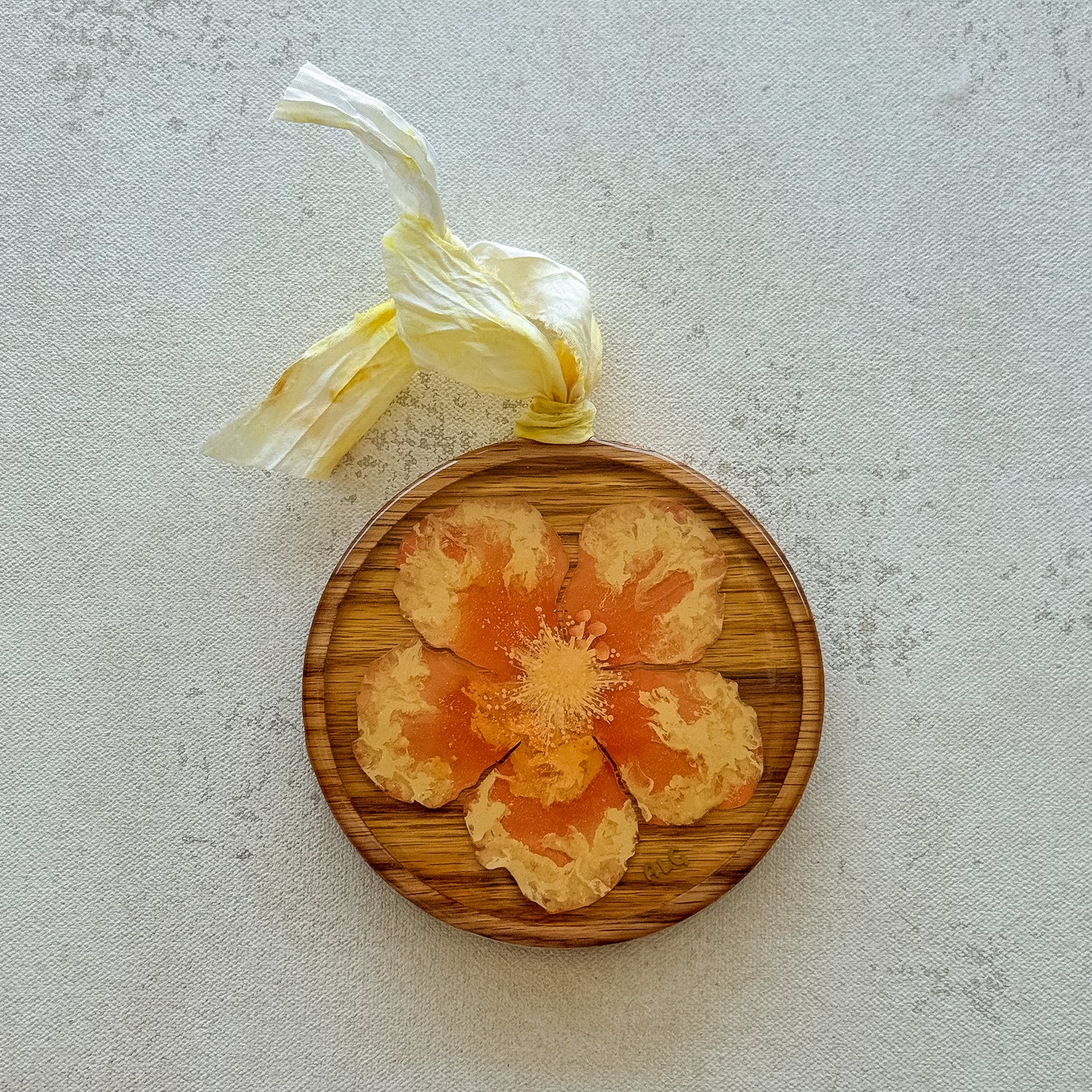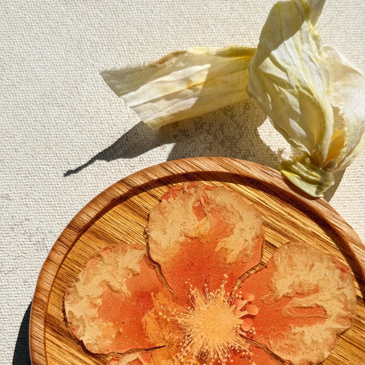 Ana Lucia poured resin coats with pure pigments to cover the piece and try to capture the fluid movements of the vibrant colors within the hibiscus. Each flower is uniquely detailed with acrylic paint. The colorful strokes of paint give a different essence to each flower.