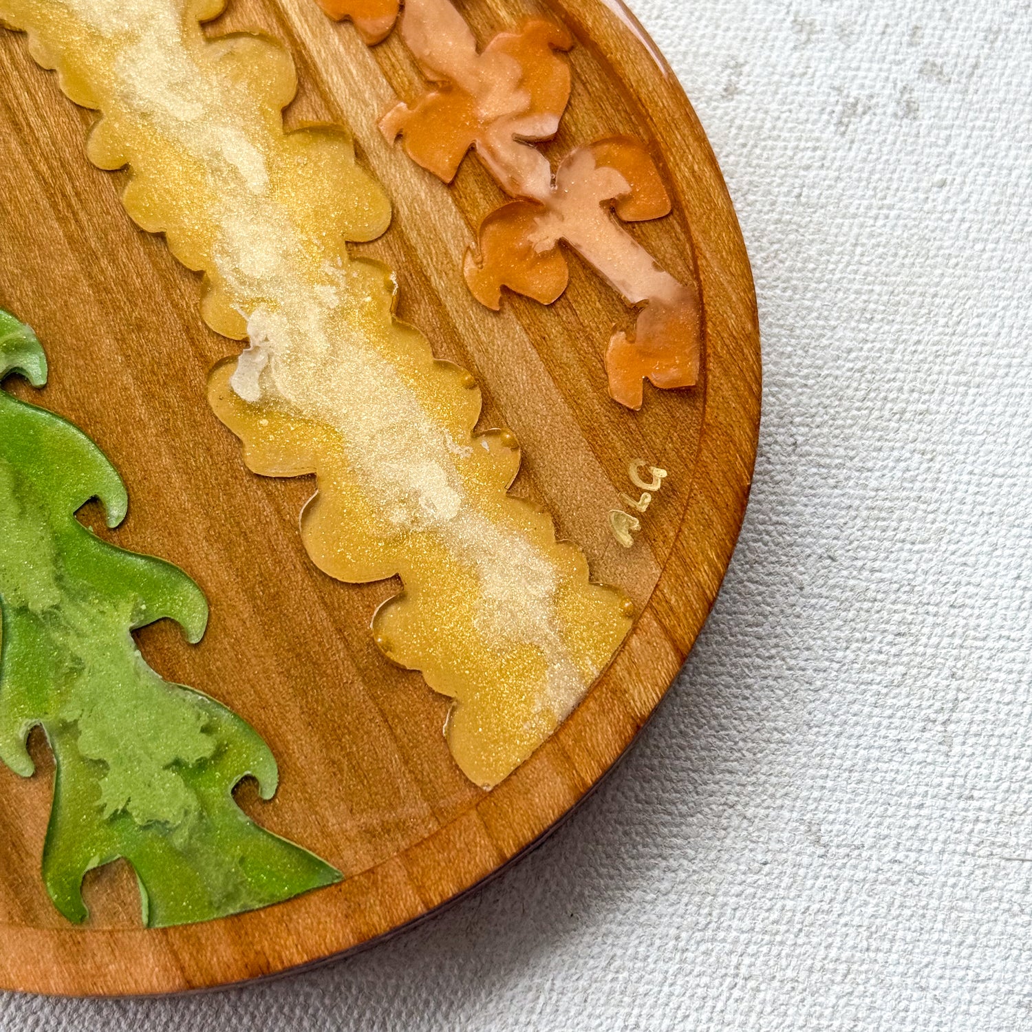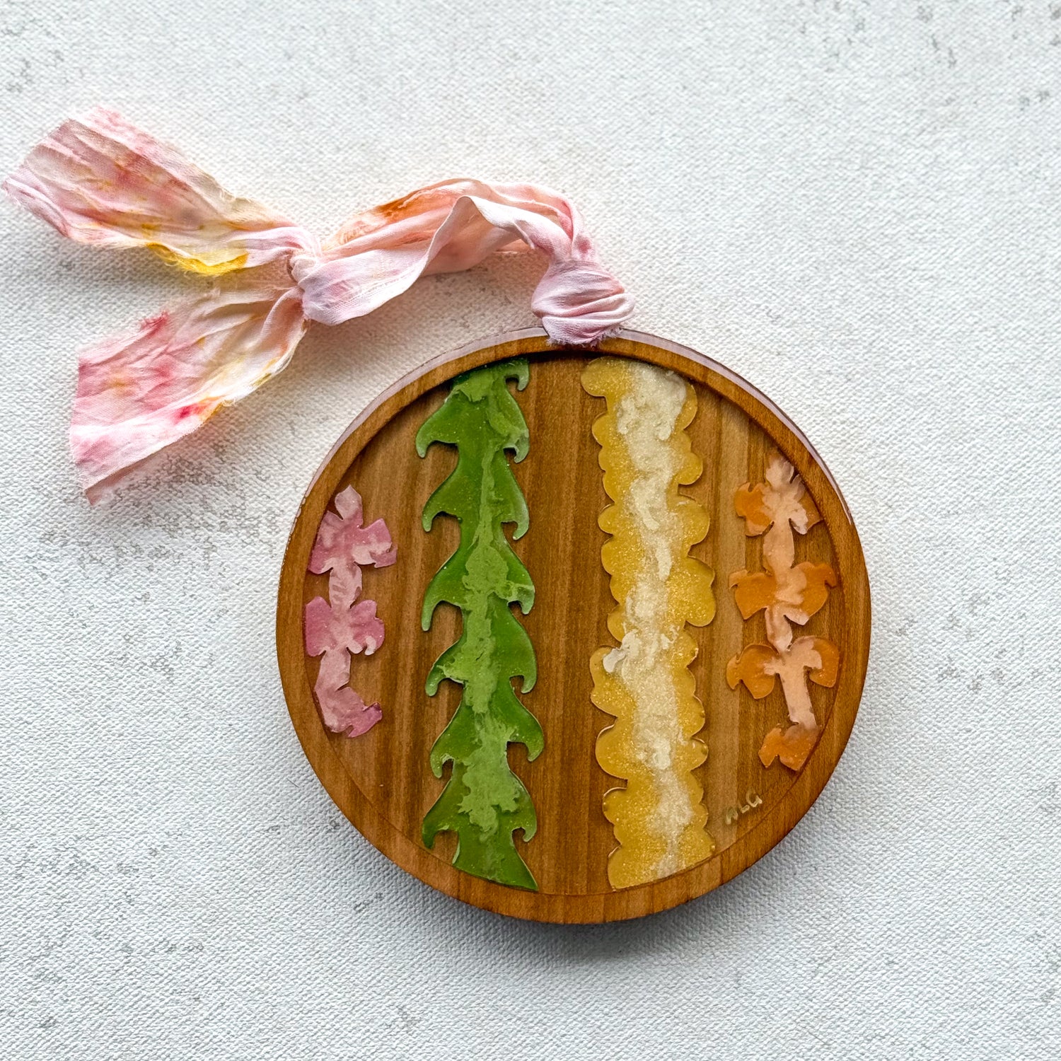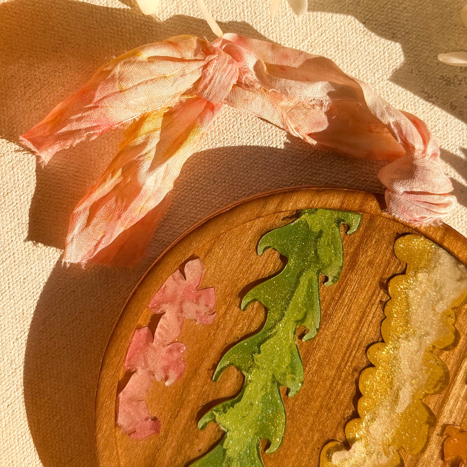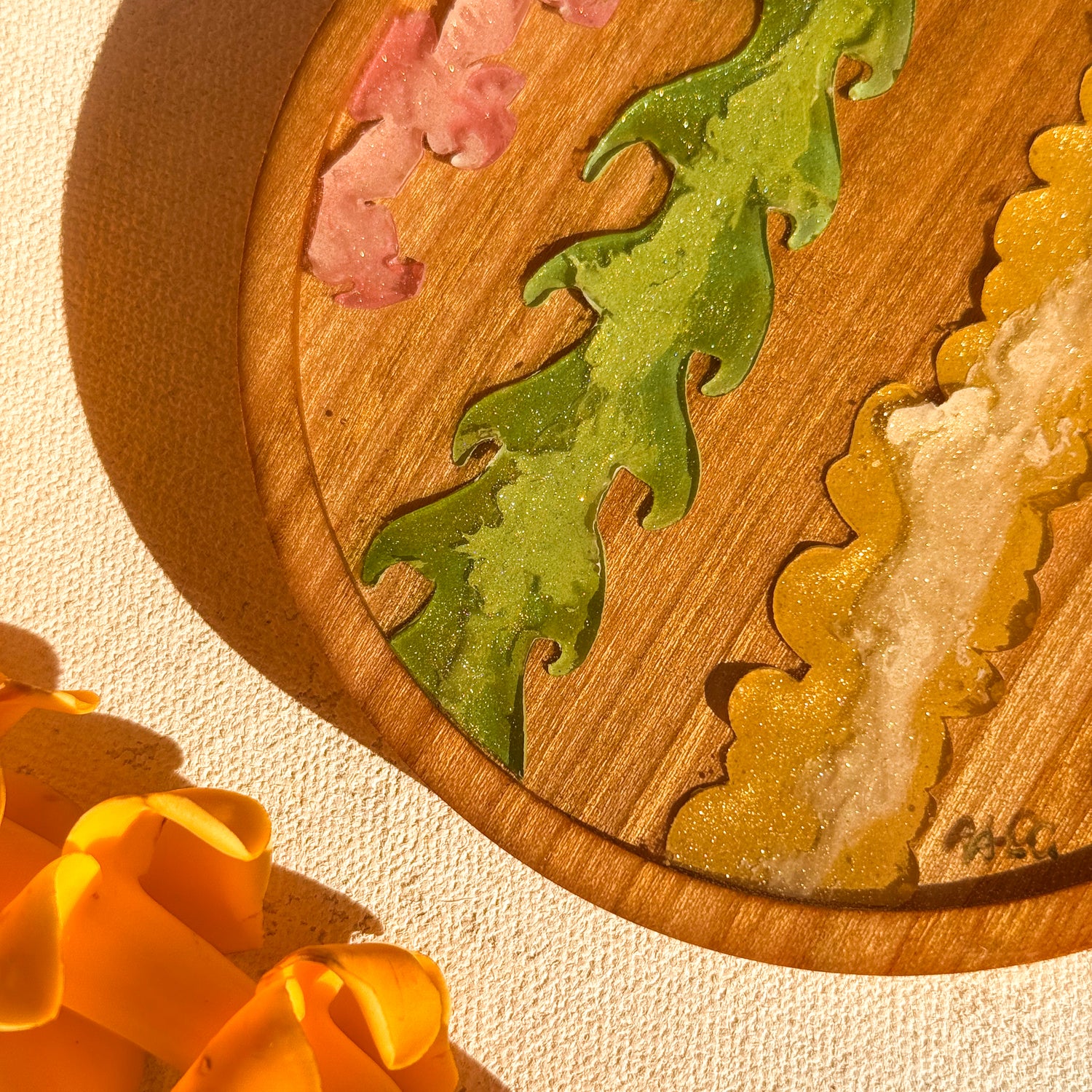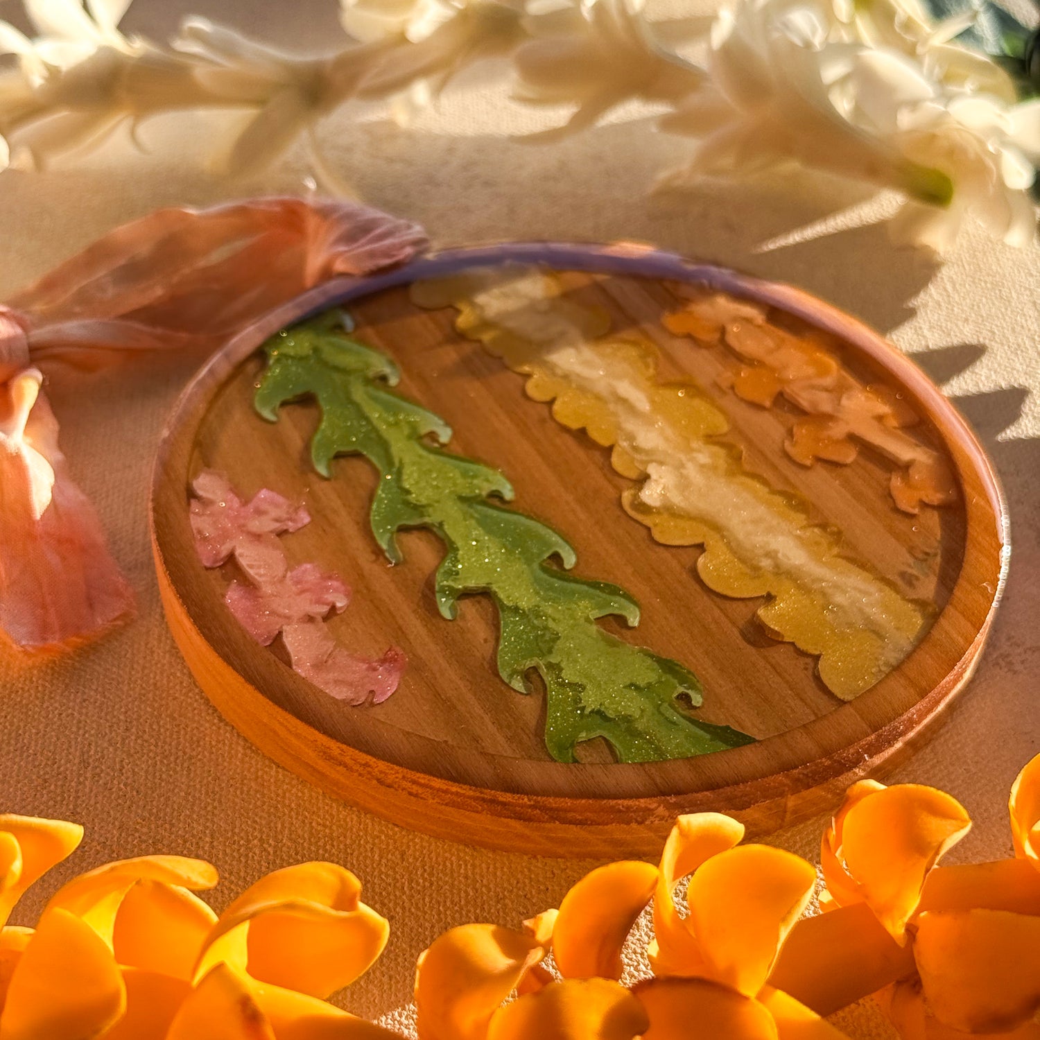 Ana Lucia poured resin coats with pure pigments to cover the piece and try to capture the fluid movements of the vibrant colors within the lei. Each flower is uniquely detailed with acrylic paint. The colorful strokes of paint give a different essence to each flower.