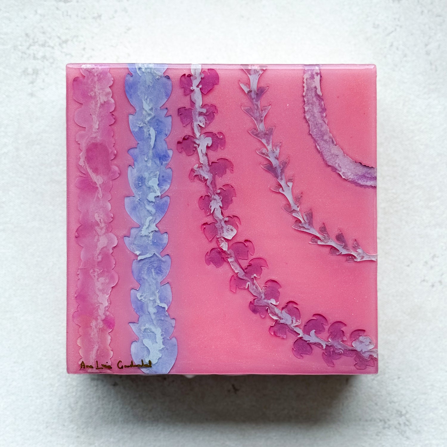 Ana Lucia poured resin coats with pure pigments to cover the piece and try to capture the fluid movements of the vibrant colors within the flowers. Each flower is uniquely detailed with acrylic paint. The colorful strokes of paint give a different essence to each flower.
