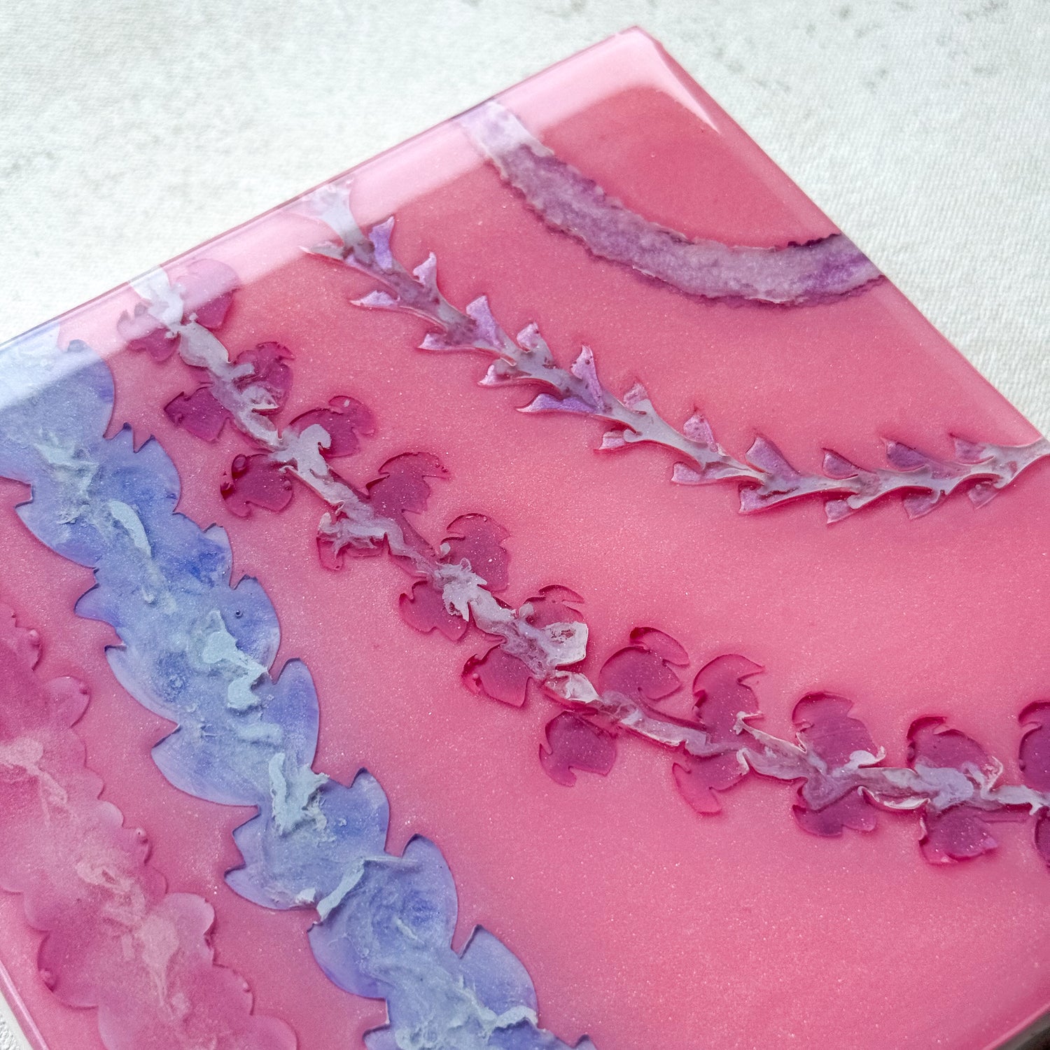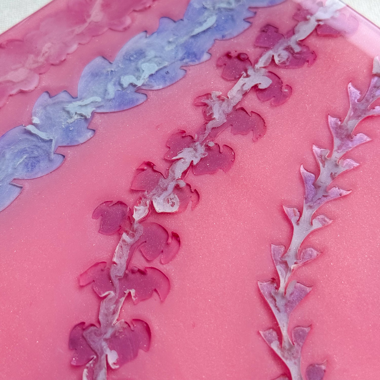 The pieces in this collection took an average of 5 weeks to make. To help preserve this piece, please keep away from direct sunlight. If needed, you can clean the surface of the piece with glass cleaner and a gentle cloth. Please note that the artist tries her best to make each piece as flawless as possible but resin is a medium that makes this very difficult. This piece might have dust particles but it does not take away from the beauty of the piece. Embracing imperfections, this piece was made with love and aloha.