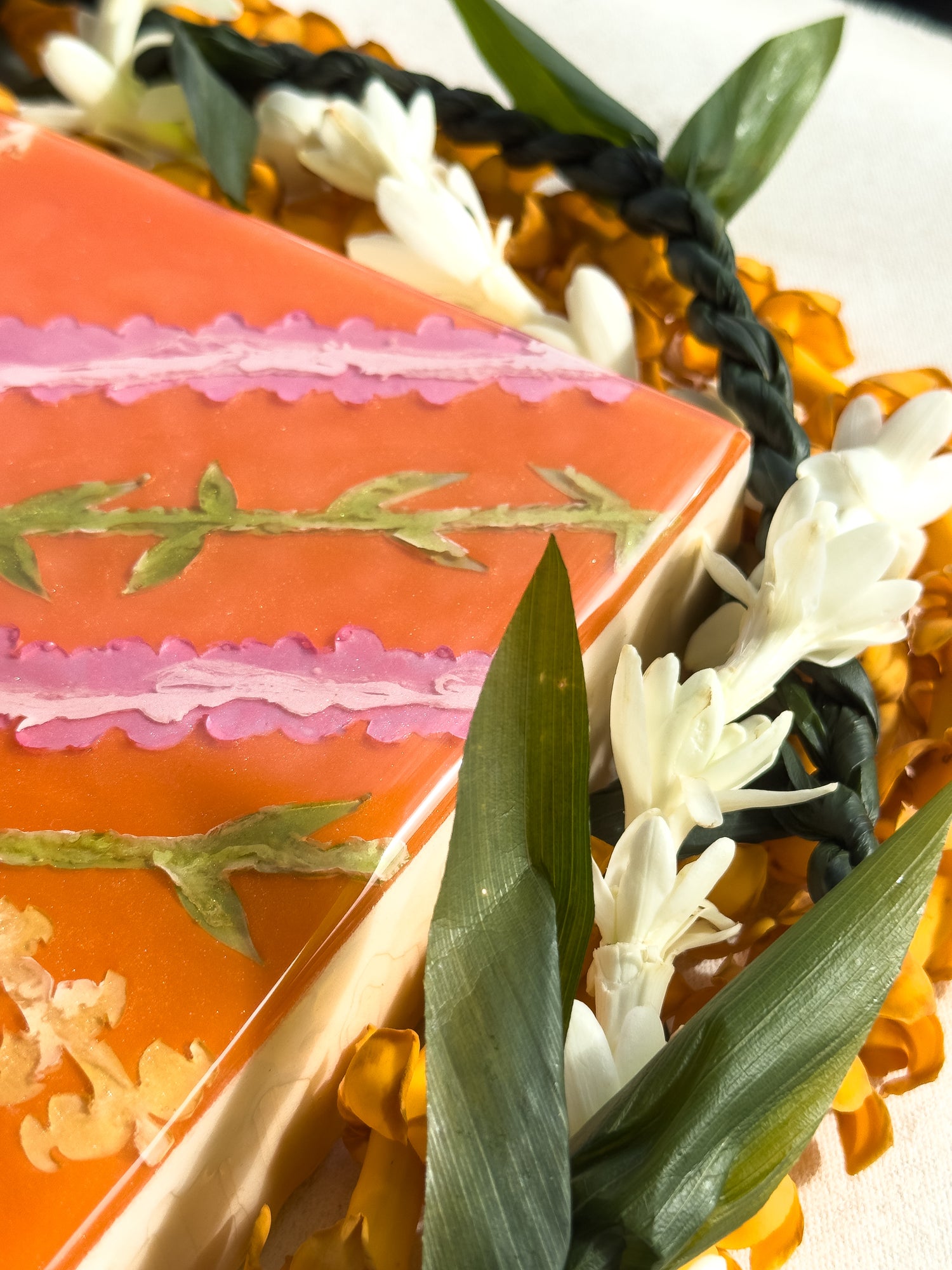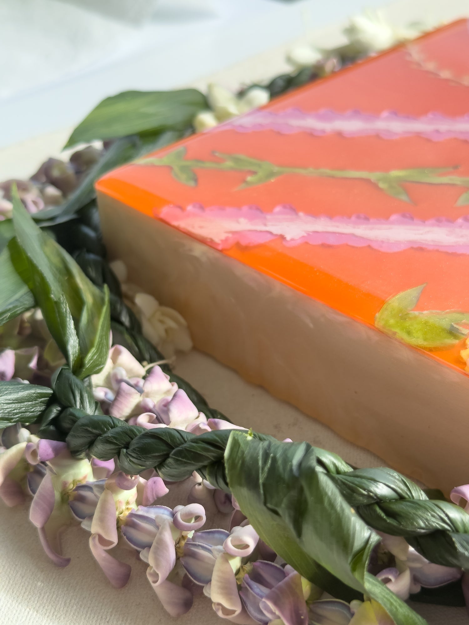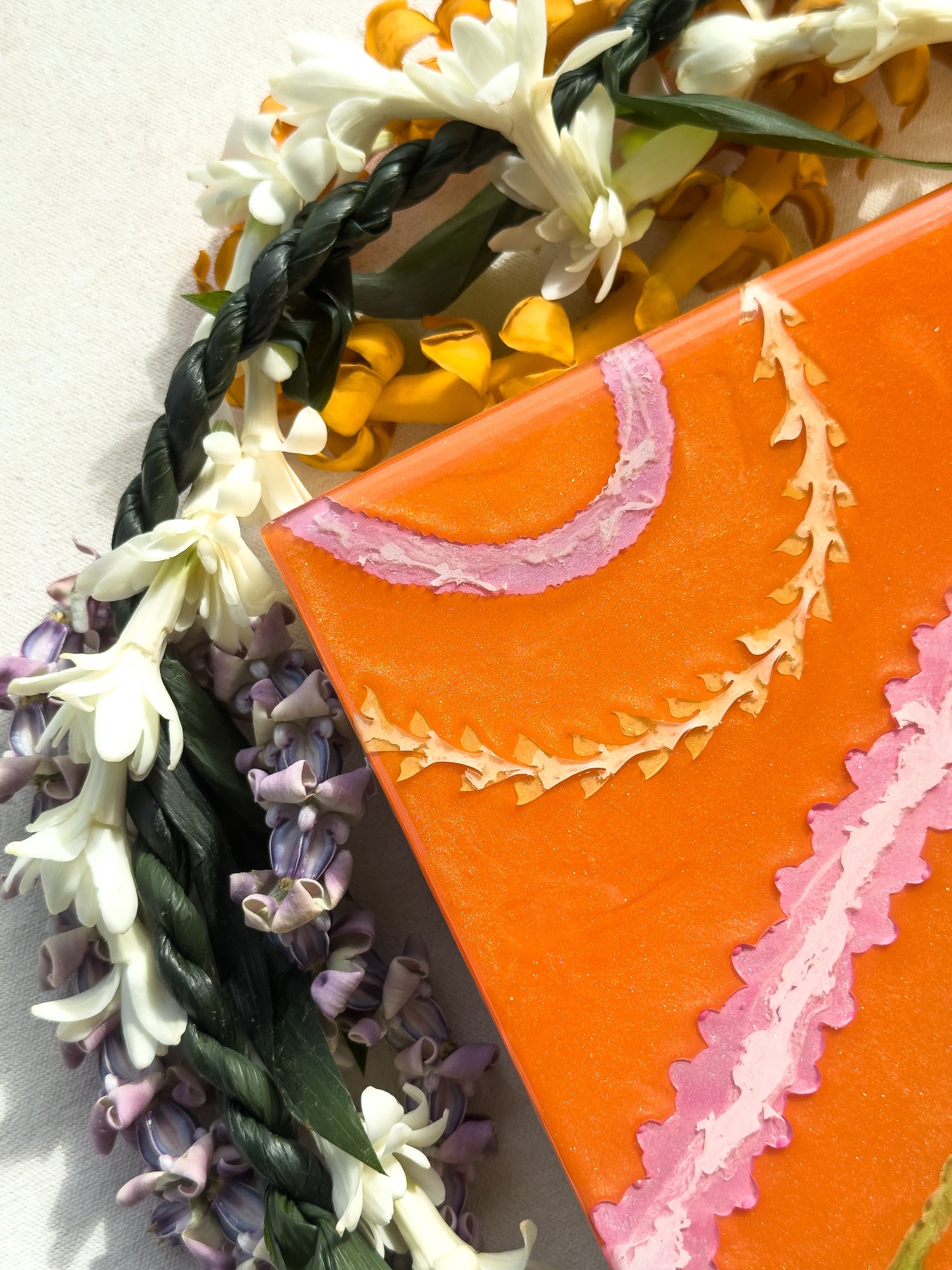 The pieces in this collection took an average of 5 weeks to make. To help preserve this piece, please keep away from direct sunlight. If needed, you can clean the surface of the piece with glass cleaner and a gentle cloth. Please note that the artist tries her best to make each piece as flawless as possible but resin is a medium that makes this very difficult. This piece might have dust particles but it does not take away from the beauty of the piece. Embracing imperfections, this piece was made with love and aloha.