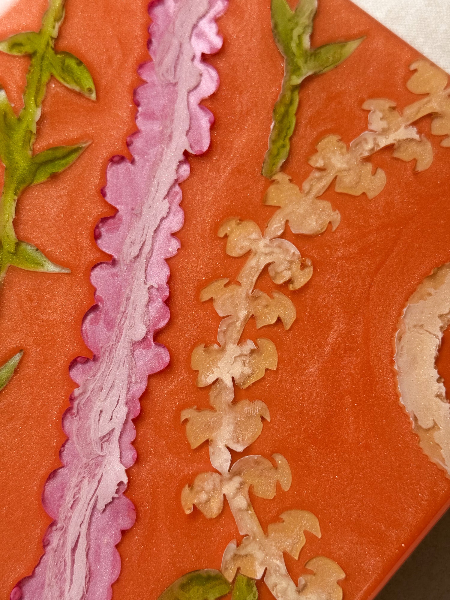 Ana Lucia poured resin coats with pure pigments to cover the piece and try to capture the fluid movements of the vibrant colors within the flowers. Each flower is uniquely detailed with acrylic paint. The colorful strokes of paint give a different essence to each flower.