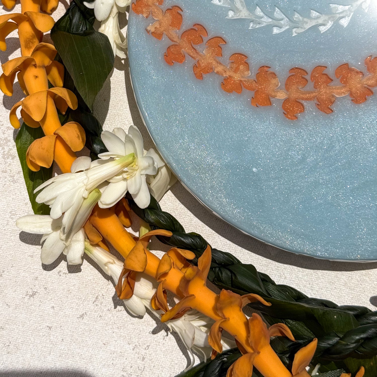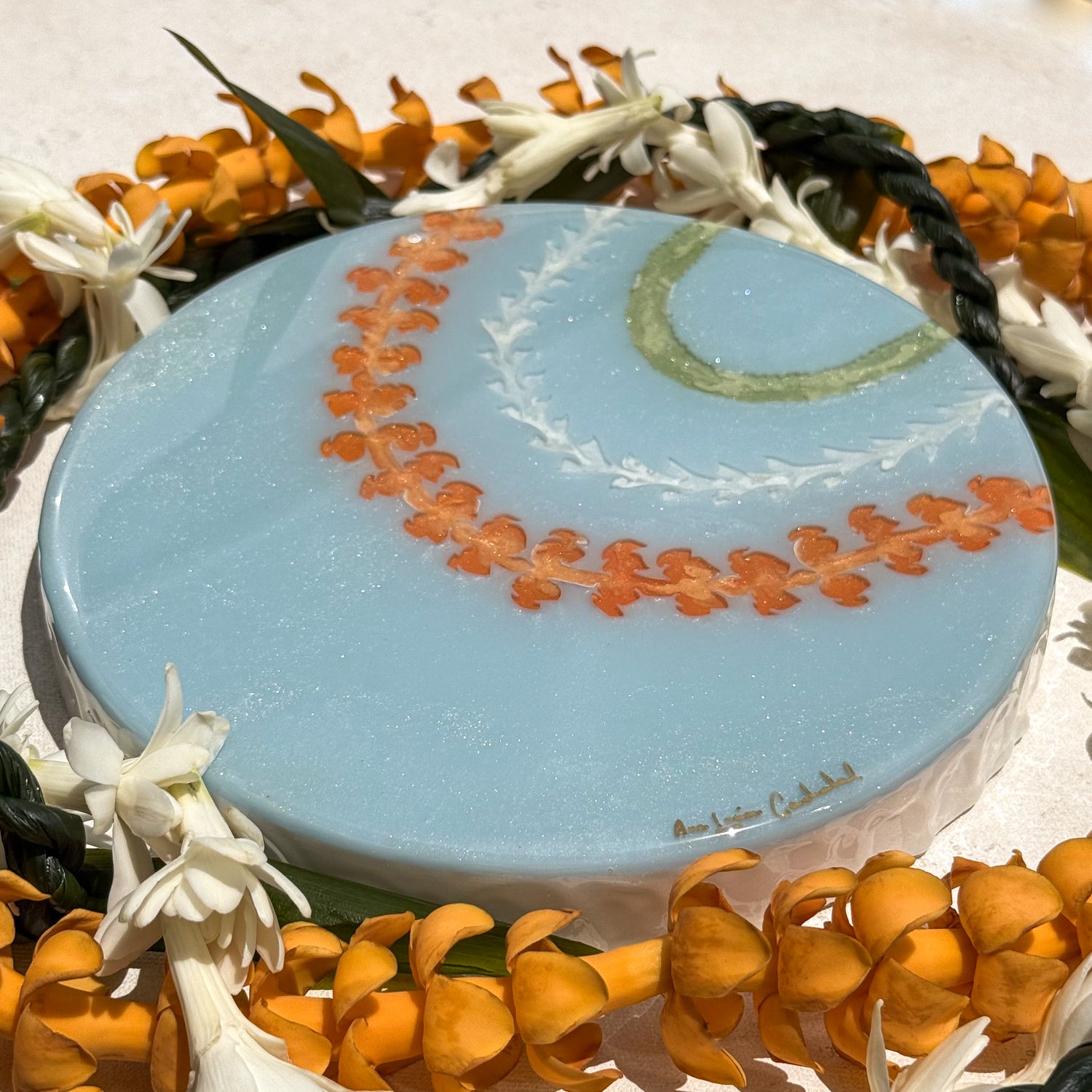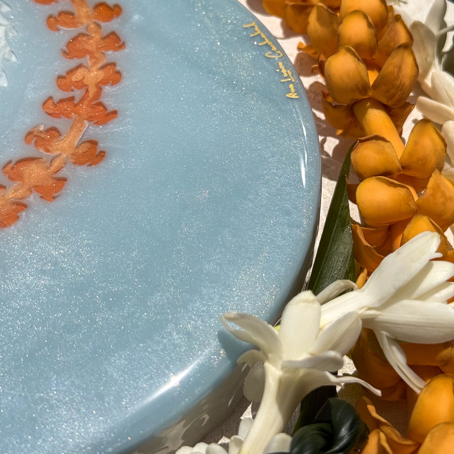 The pieces in this collection took an average of 5 weeks to make. To help preserve this piece, please keep away from direct sunlight. If needed, you can clean the surface of the piece with glass cleaner and a gentle cloth. Please note that the artist tries her best to make each piece as flawless as possible but resin is a medium that makes this very difficult. This piece might have dust particles but it does not take away from the beauty of the piece. Embracing imperfections, this piece was made with love and aloha.