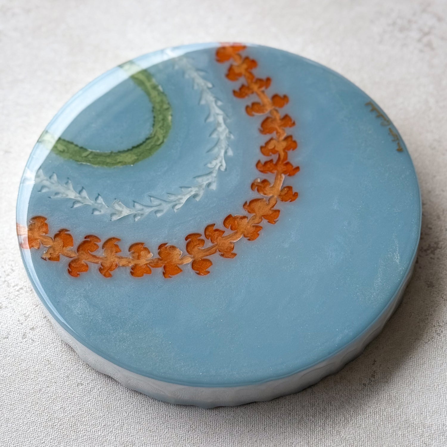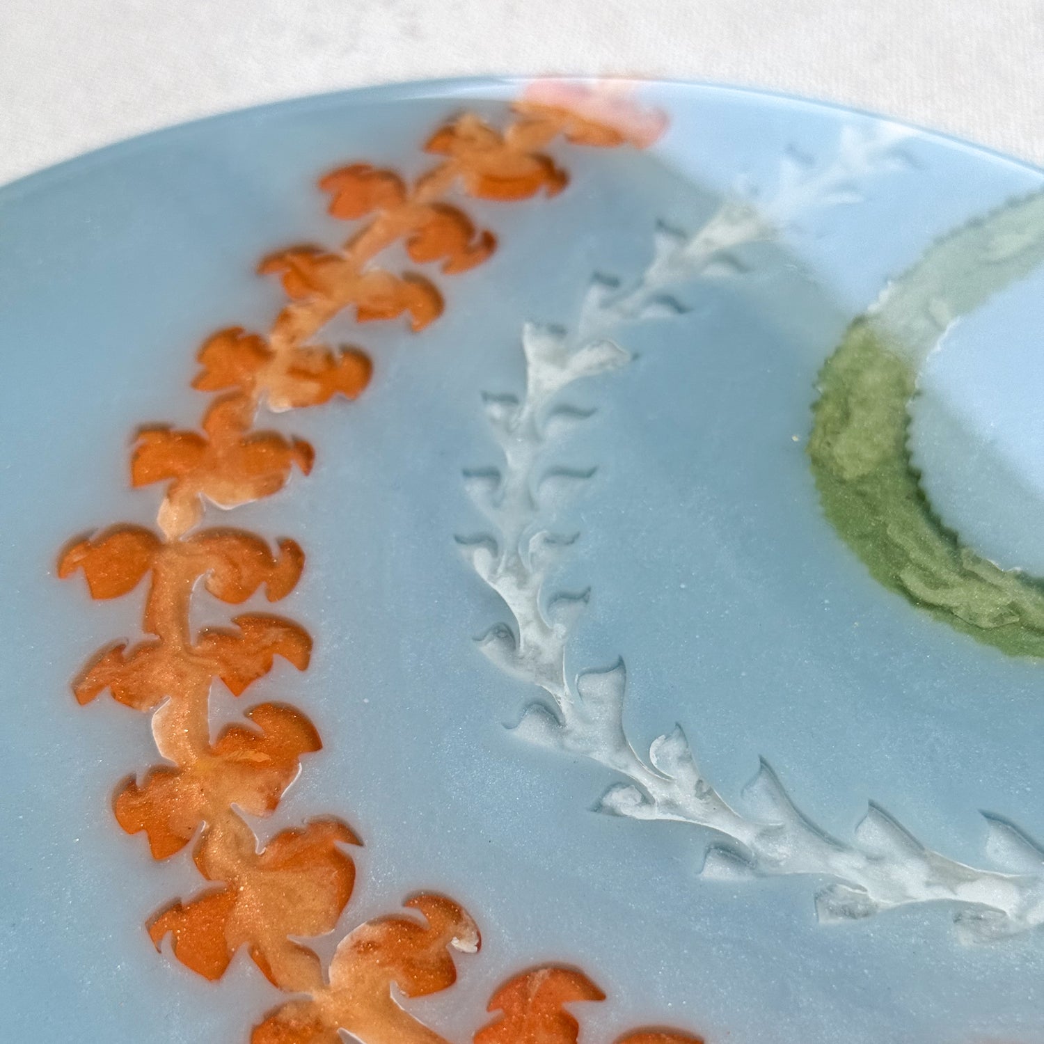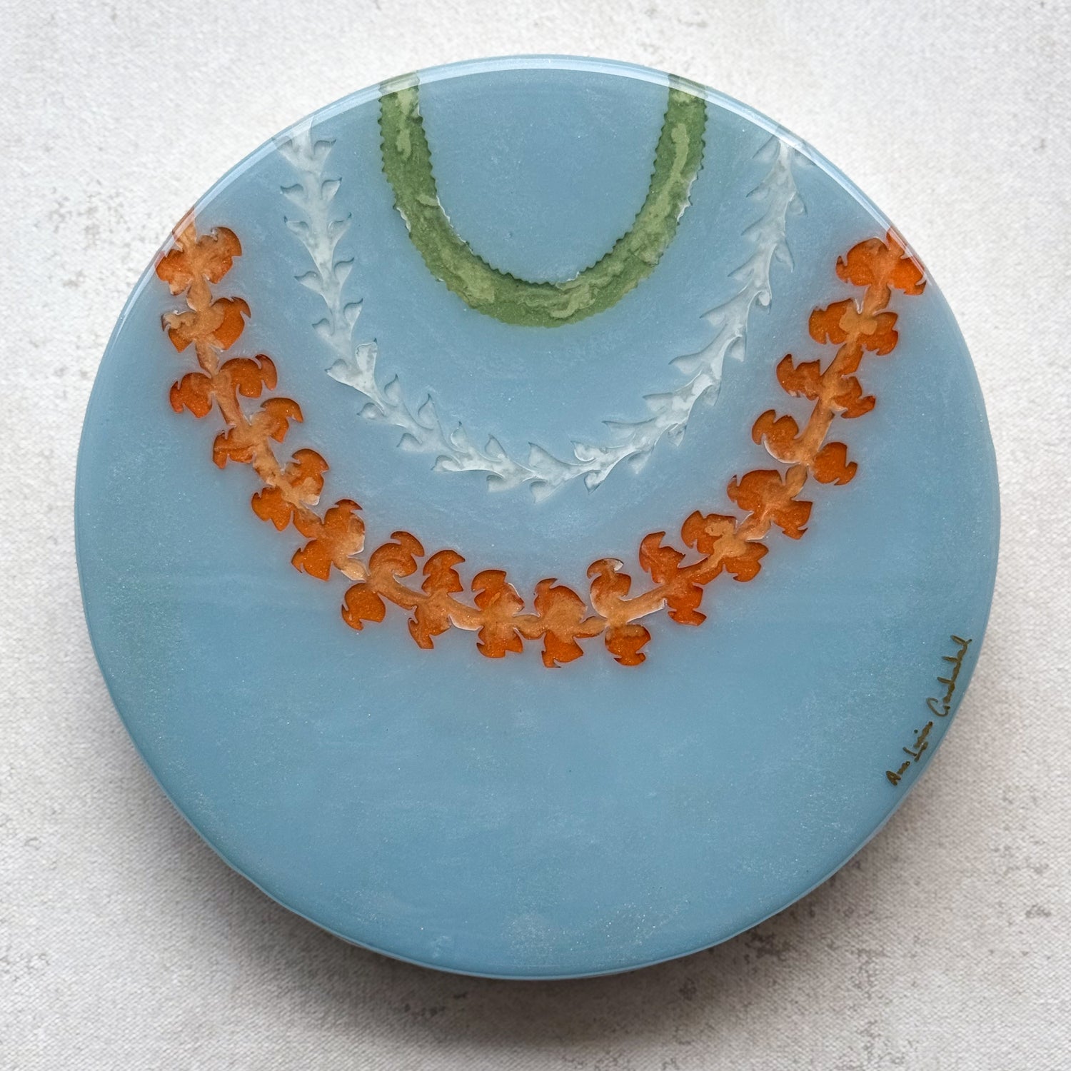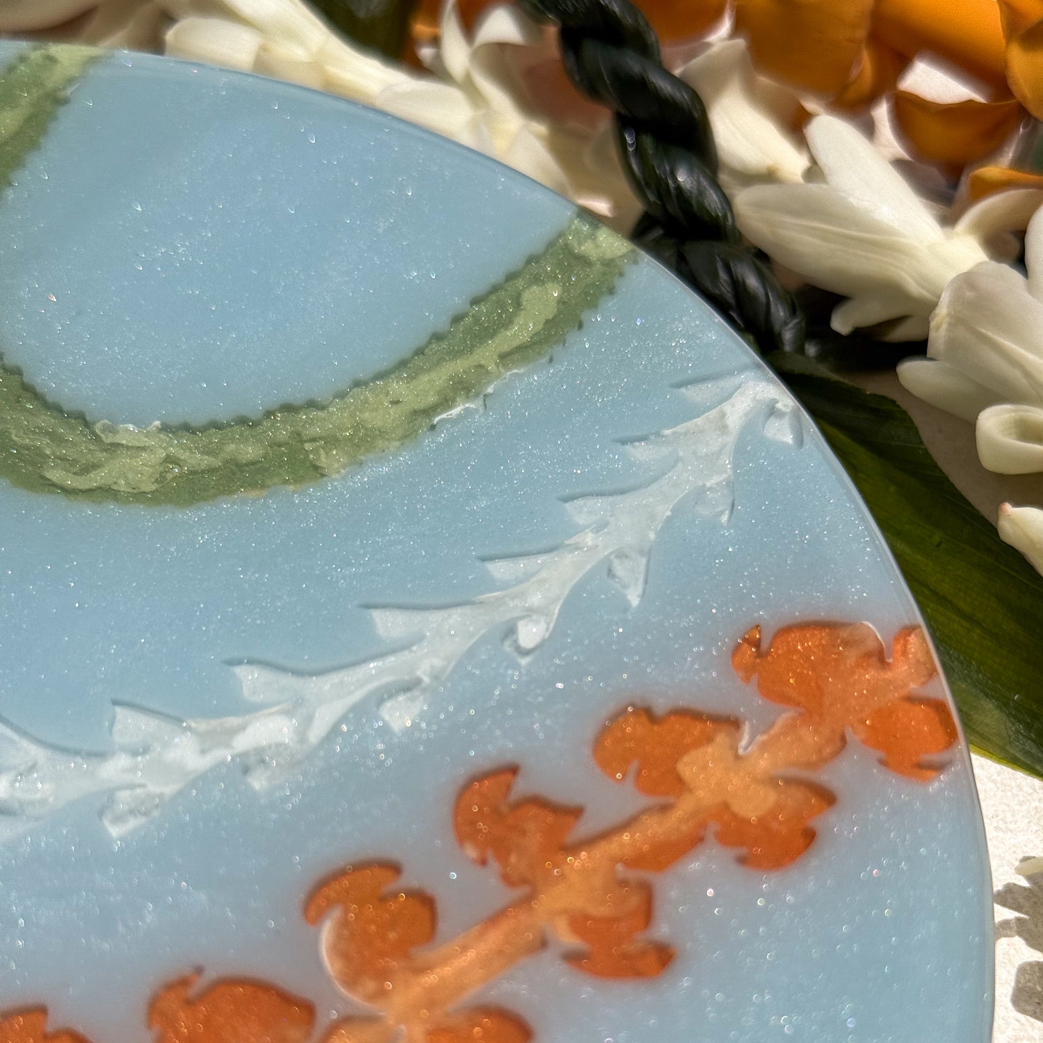 The pieces in this collection took an average of 5 weeks to make. To help preserve this piece, please keep away from direct sunlight. If needed, you can clean the surface of the piece with glass cleaner and a gentle cloth. Please note that the artist tries her best to make each piece as flawless as possible but resin is a medium that makes this very difficult. This piece might have dust particles but it does not take away from the beauty of the piece. Embracing imperfections, this piece was made with love and aloha.