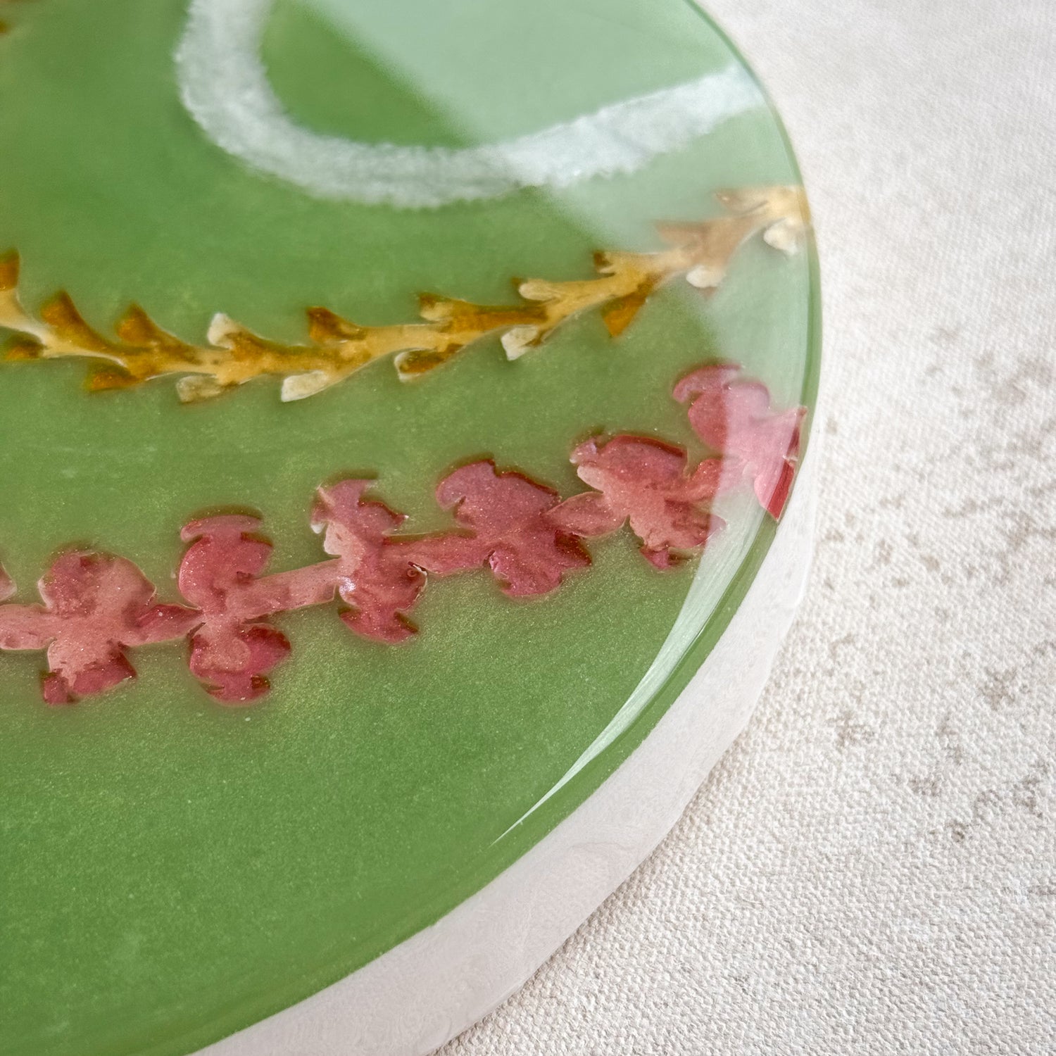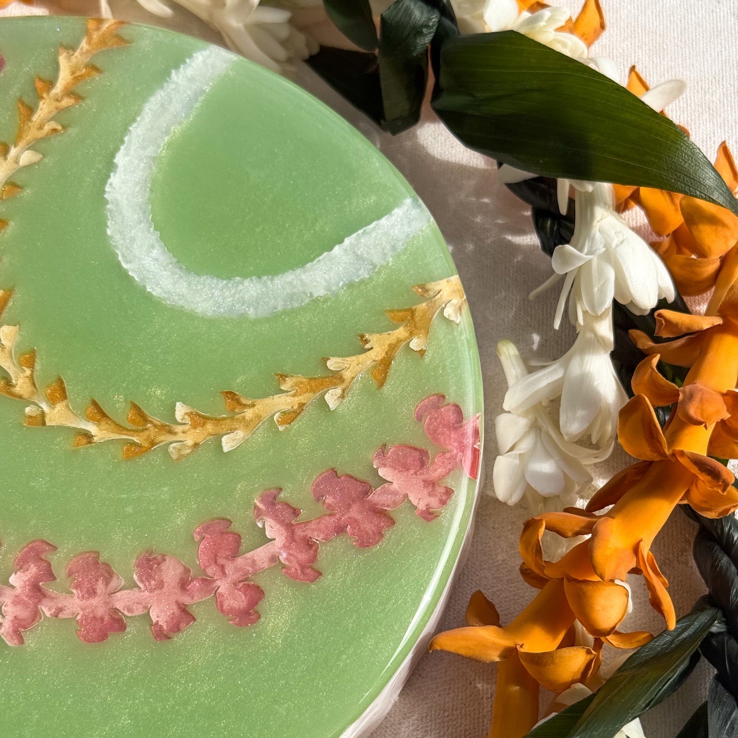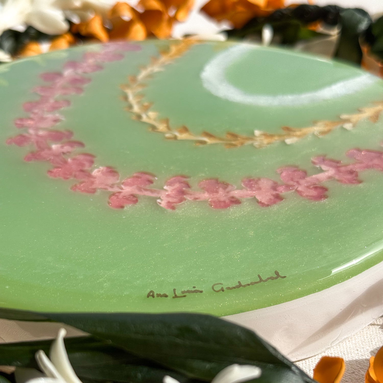 The pieces in this collection took an average of 5 weeks to make. To help preserve this piece, please keep away from direct sunlight. If needed, you can clean the surface of the piece with glass cleaner and a gentle cloth. Please note that the artist tries her best to make each piece as flawless as possible but resin is a medium that makes this very difficult. This piece might have dust particles but it does not take away from the beauty of the piece. Embracing imperfections, this piece was made with love and aloha.