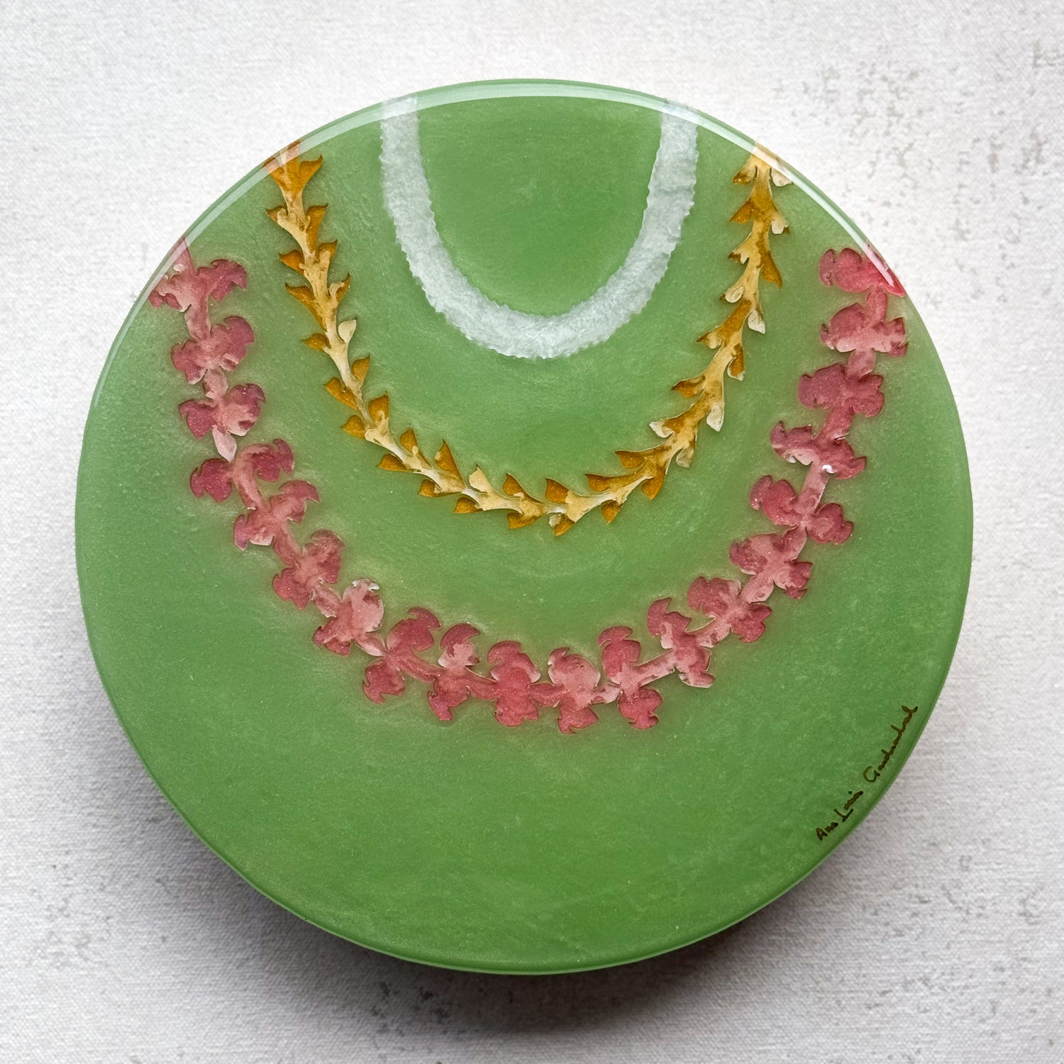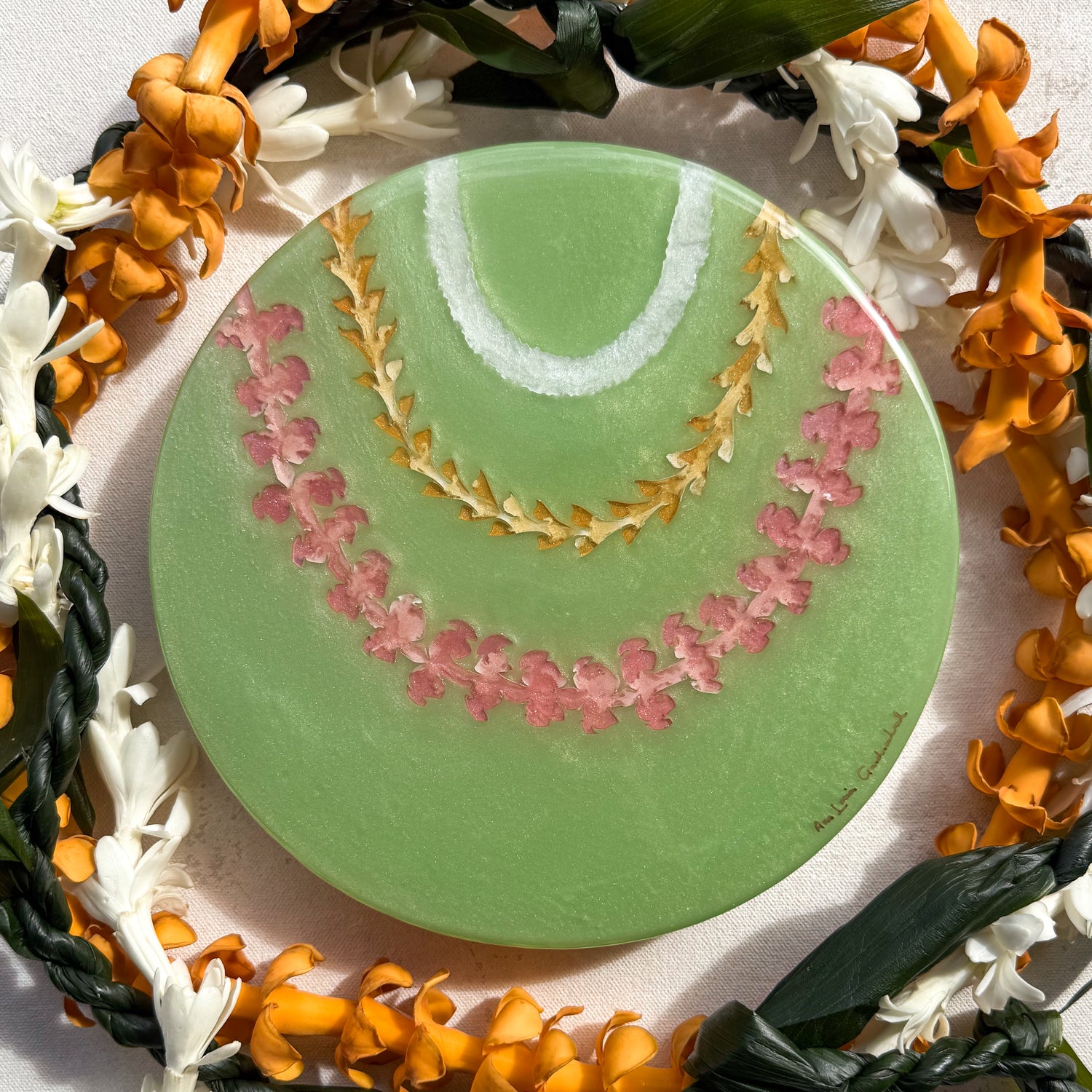 The “Lei Mau Loa” Collection celebrates the timeless tradition of the Hawaiian lei, symbolizing love, honor, and connection. This piece embodies the spirit of “Lei Mau Loa,” which means “eternal lei” in Hawaiian. Inspired by the enduring beauty of the islands, “Forever Lei” represents the everlasting bonds we share with loved ones and the vibrant aloha that flows year-round in Hawai‘i. Just as leis are woven with care and meaning, this piece captures the joyful colors and textures of flowers that bloom across the islands, honoring a tradition that never fades.