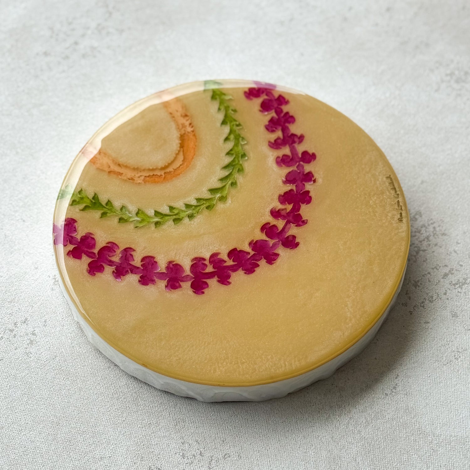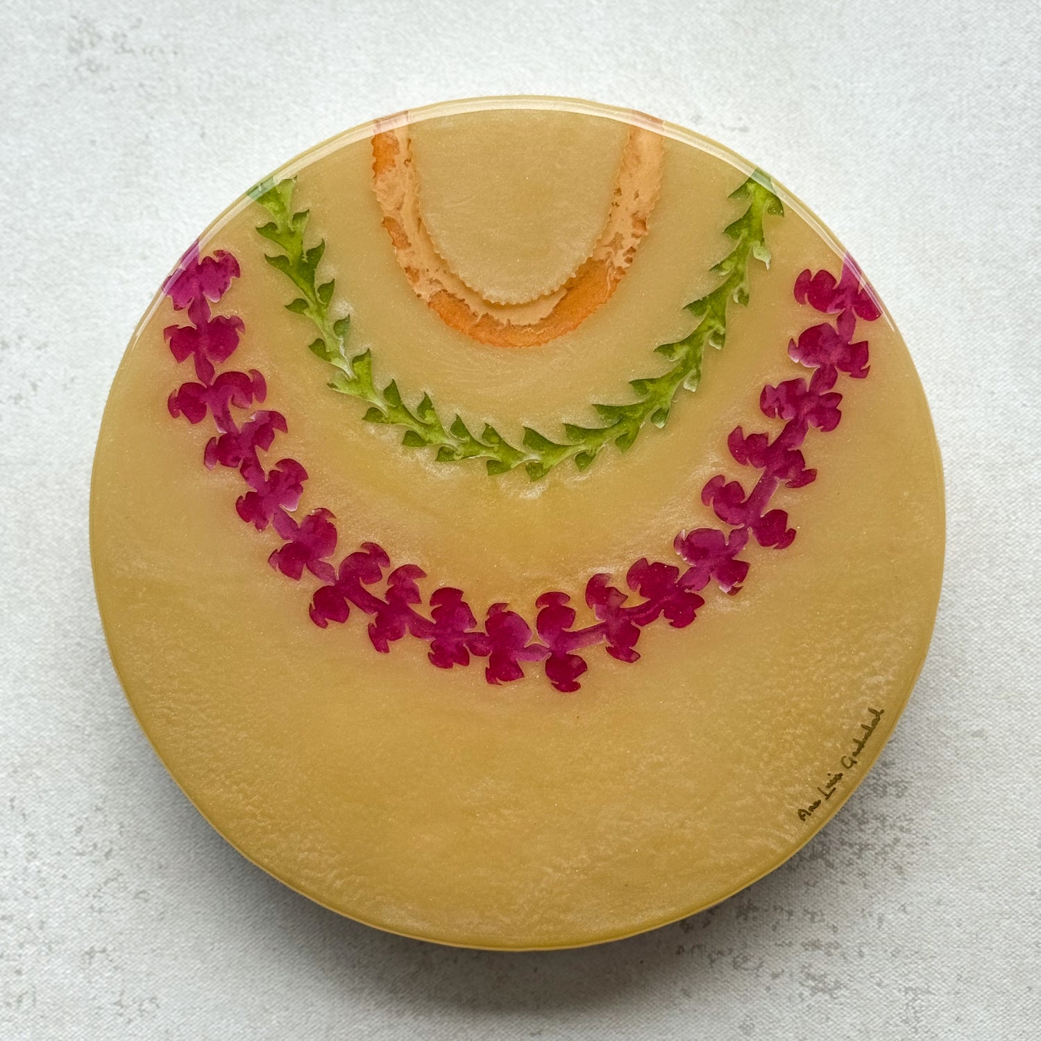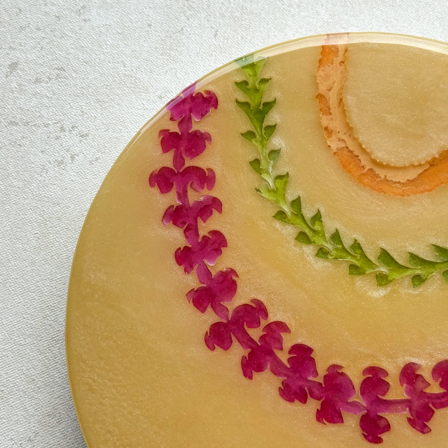 The pieces in this collection took an average of 5 weeks to make. To help preserve this piece, please keep away from direct sunlight. If needed, you can clean the surface of the piece with glass cleaner and a gentle cloth. Please note that the artist tries her best to make each piece as flawless as possible but resin is a medium that makes this very difficult. This piece might have dust particles but it does not take away from the beauty of the piece. Embracing imperfections, this piece was made with love and aloha.