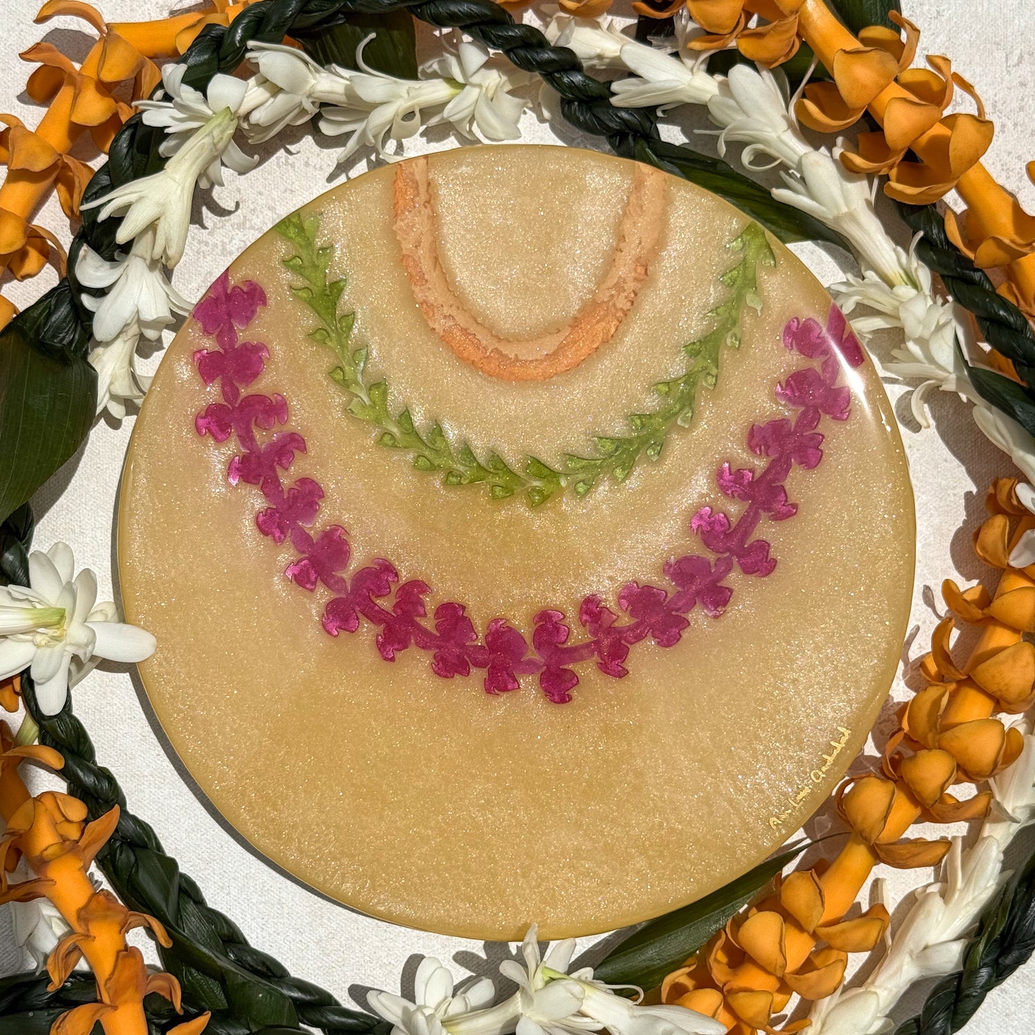 The “Lei Mau Loa” Collection celebrates the timeless tradition of the Hawaiian lei, symbolizing love, honor, and connection. This piece embodies the spirit of “Lei Mau Loa,” which means “eternal lei” in Hawaiian. Inspired by the enduring beauty of the islands, “Forever Lei” represents the everlasting bonds we share with loved ones and the vibrant aloha that flows year-round in Hawai‘i. Just as leis are woven with care and meaning, this piece captures the joyful colors and textures of flowers that bloom across the islands, honoring a tradition that never fades.