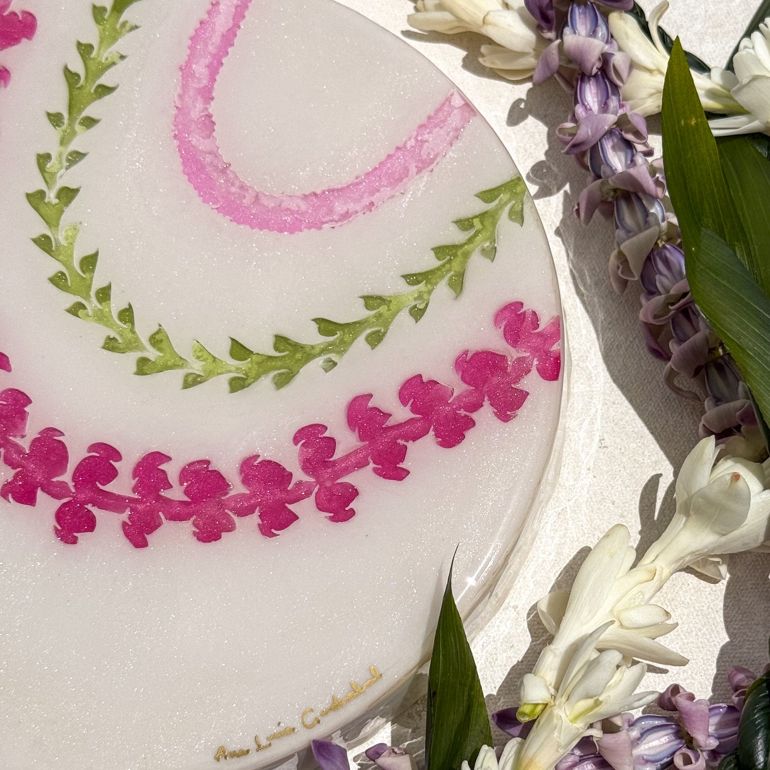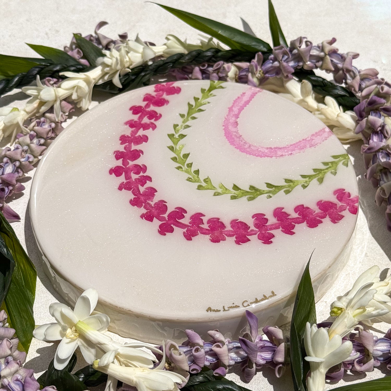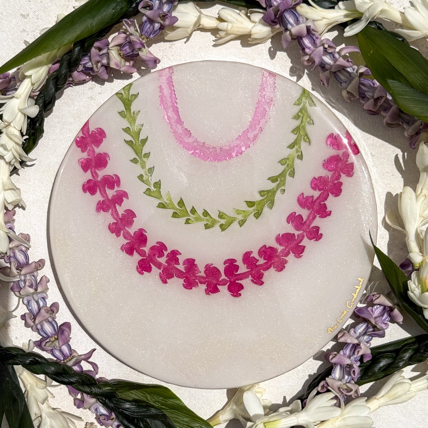 The “Lei Mau Loa” Collection celebrates the timeless tradition of the Hawaiian lei, symbolizing love, honor, and connection. This piece embodies the spirit of “Lei Mau Loa,” which means “eternal lei” in Hawaiian. Inspired by the enduring beauty of the islands, “Forever Lei” represents the everlasting bonds we share with loved ones and the vibrant aloha that flows year-round in Hawai‘i. Just as leis are woven with care and meaning, this piece captures the joyful colors and textures of flowers that bloom across the islands, honoring a tradition that never fades.