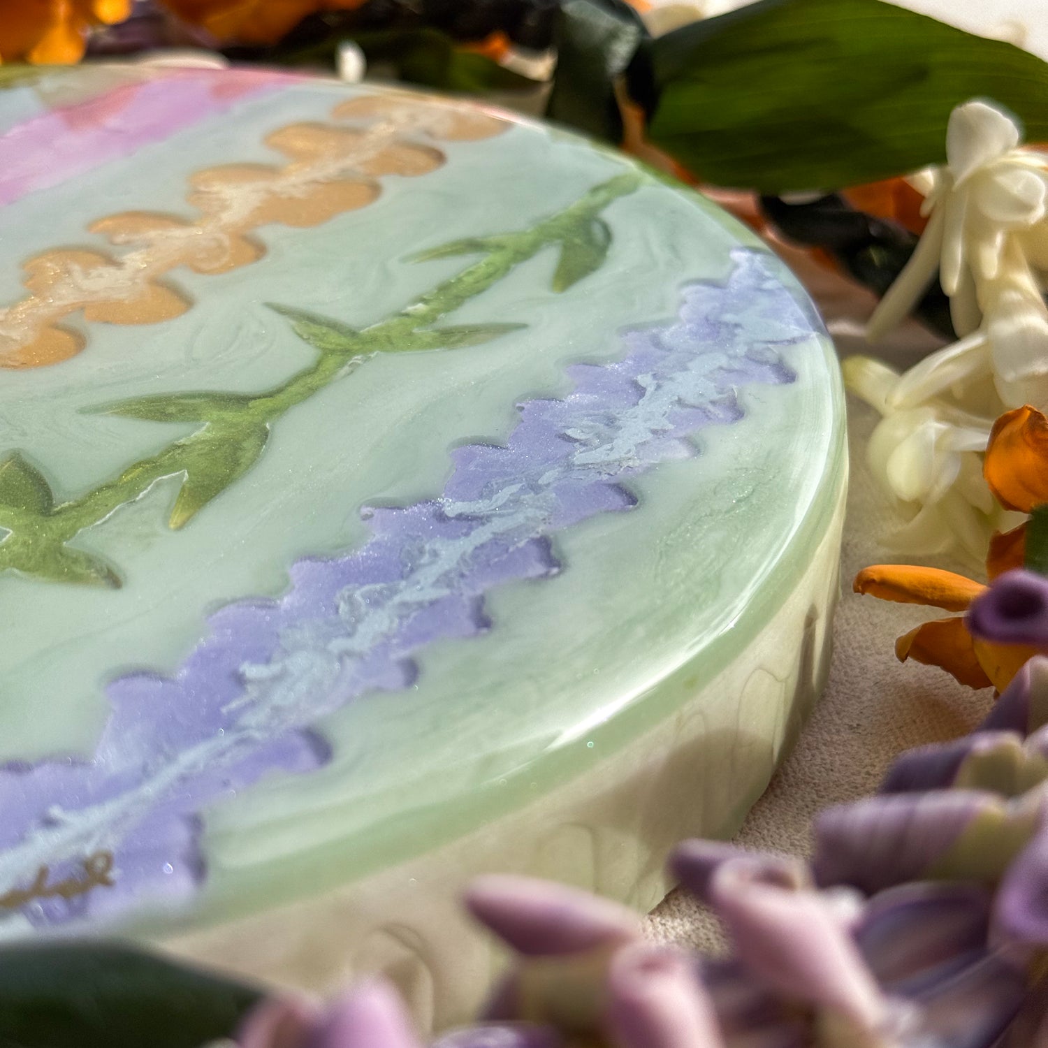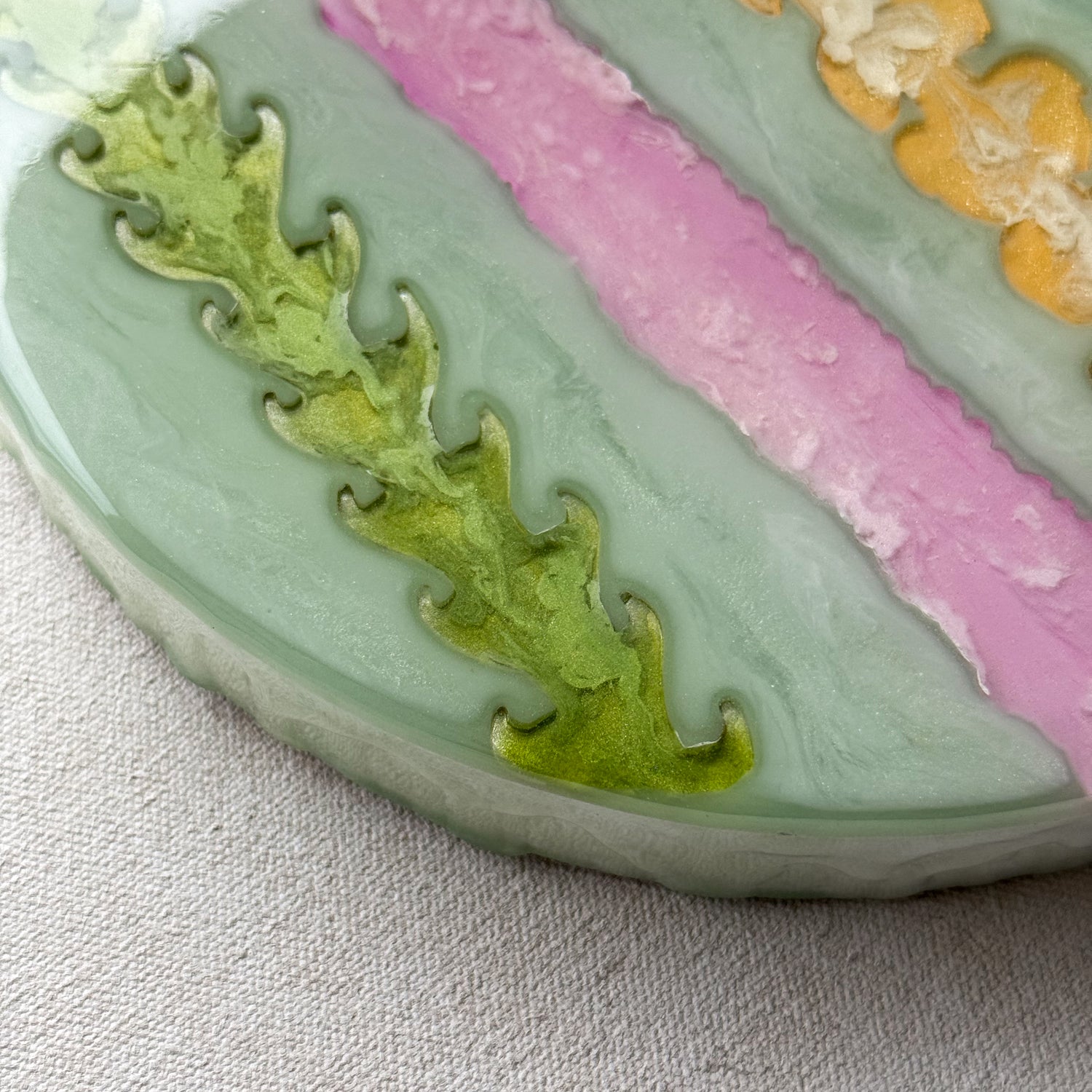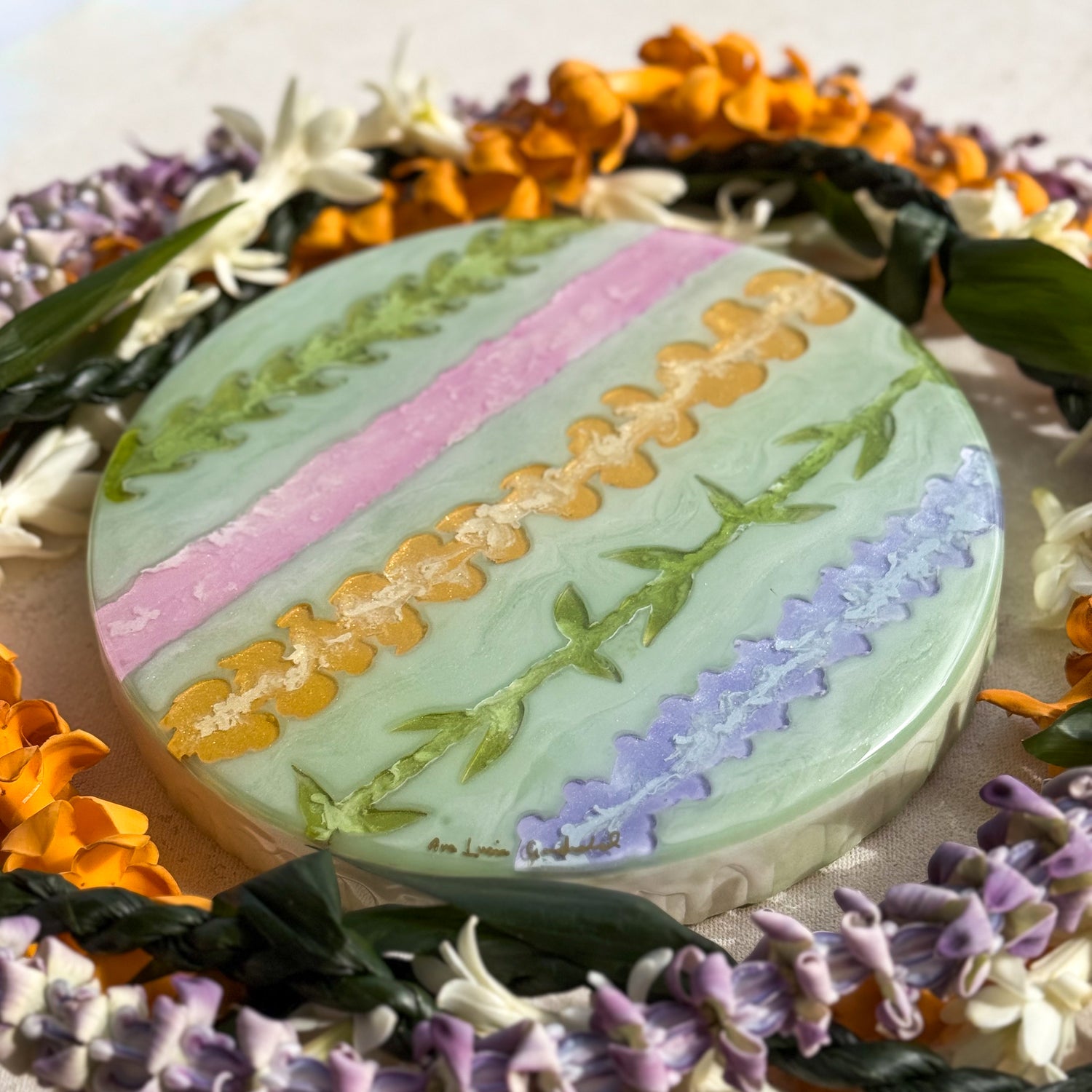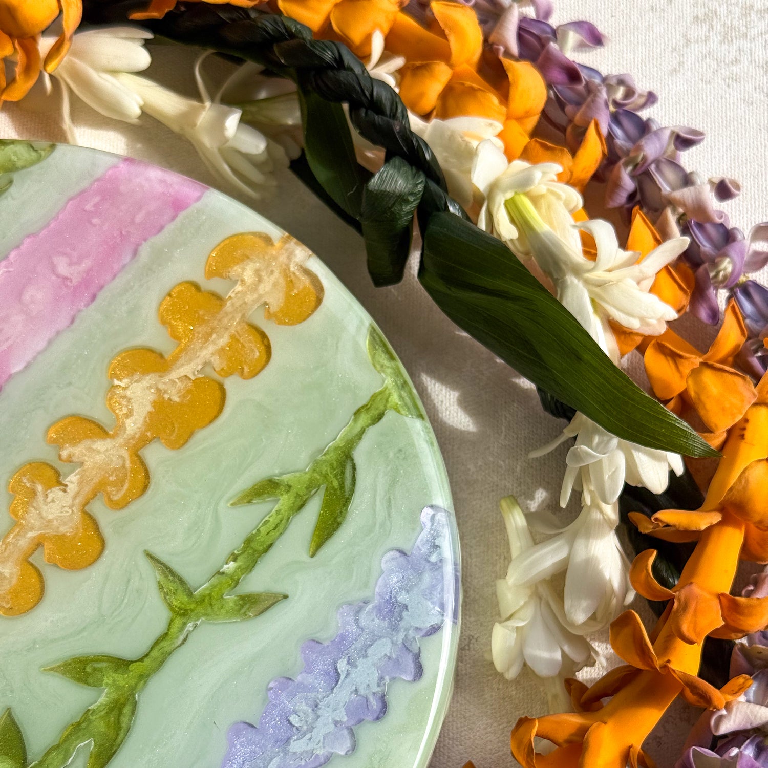 The pieces in this collection took an average of 5 weeks to make. To help preserve this piece, please keep away from direct sunlight. If needed, you can clean the surface of the piece with glass cleaner and a gentle cloth. Please note that the artist tries her best to make each piece as flawless as possible but resin is a medium that makes this very difficult. This piece might have dust particles but it does not take away from the beauty of the piece. Embracing imperfections, this piece was made with love and aloha.