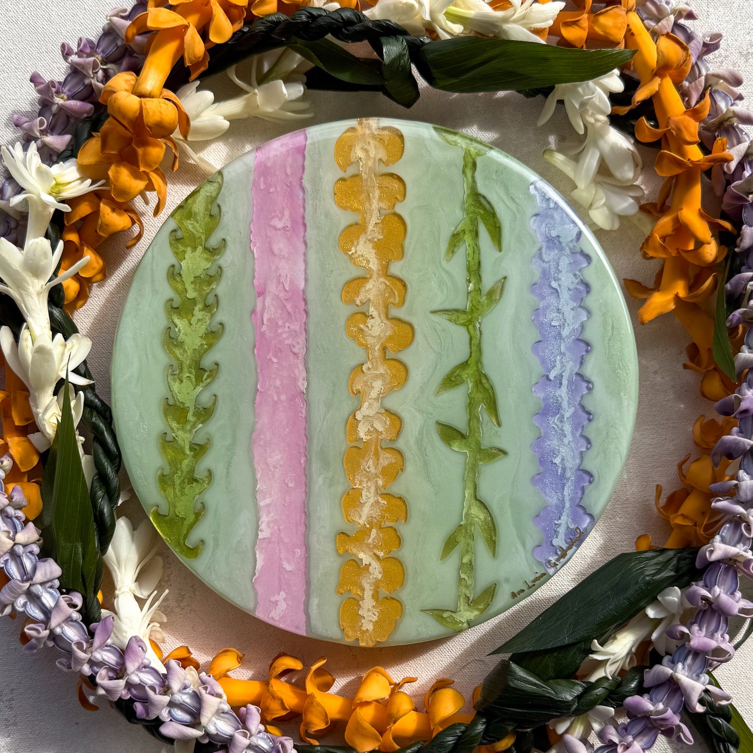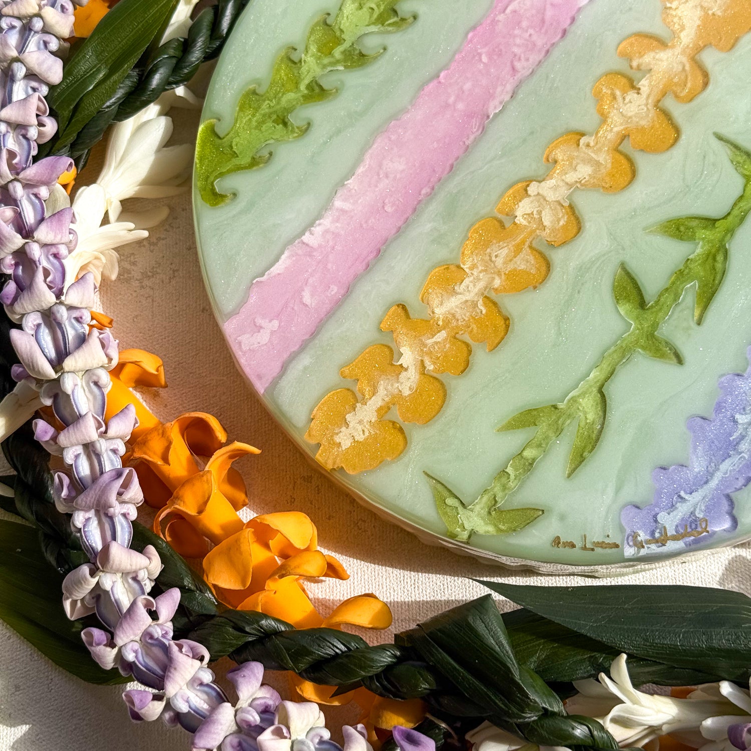 The “Lei Mau Loa” Collection celebrates the timeless tradition of the Hawaiian lei, symbolizing love, honor, and connection. This piece embodies the spirit of “Lei Mau Loa,” which means “eternal lei” in Hawaiian. Inspired by the enduring beauty of the islands, “Forever Lei” represents the everlasting bonds we share with loved ones and the vibrant aloha that flows year-round in Hawai‘i. Just as leis are woven with care and meaning, this piece captures the joyful colors and textures of flowers that bloom across the islands, honoring a tradition that never fades.