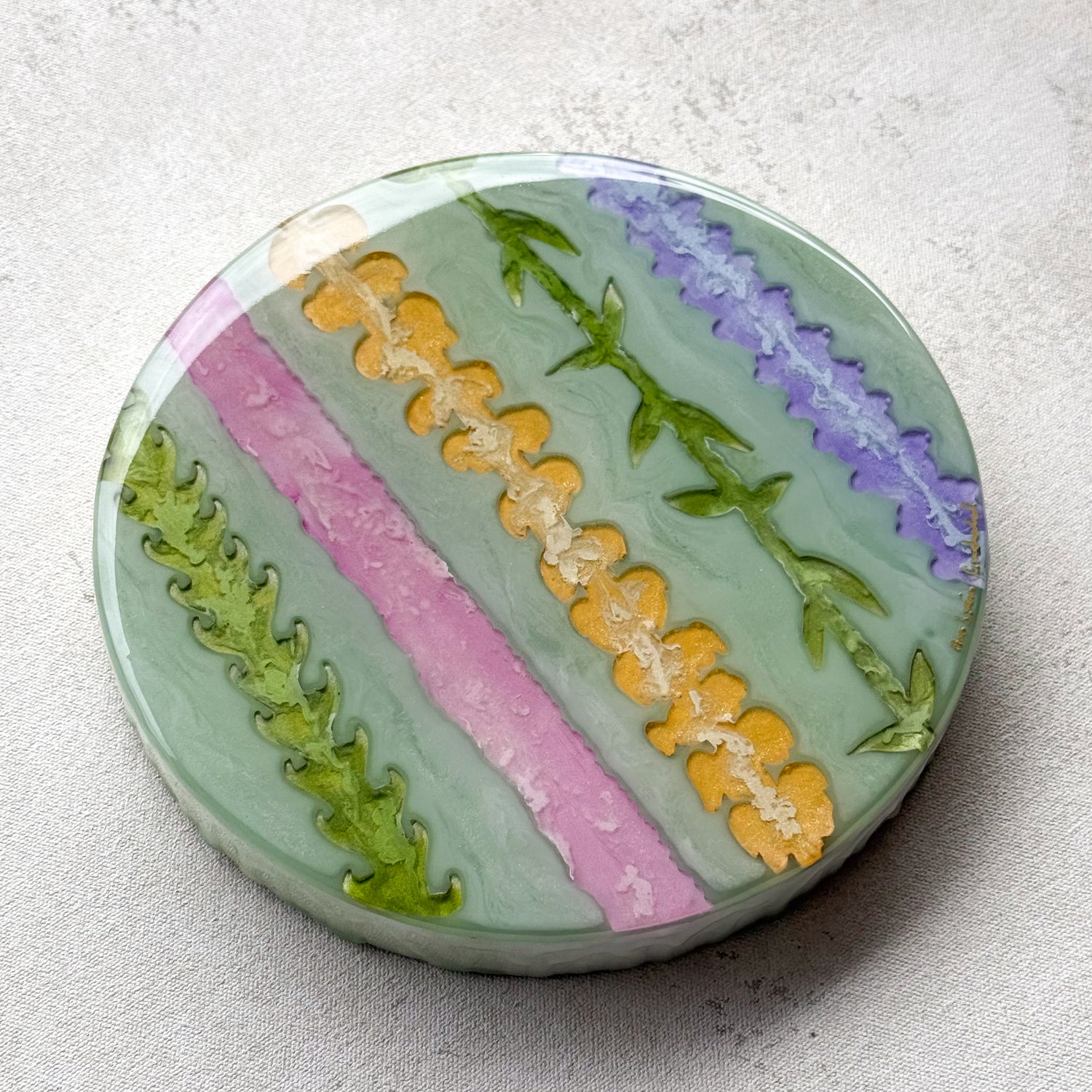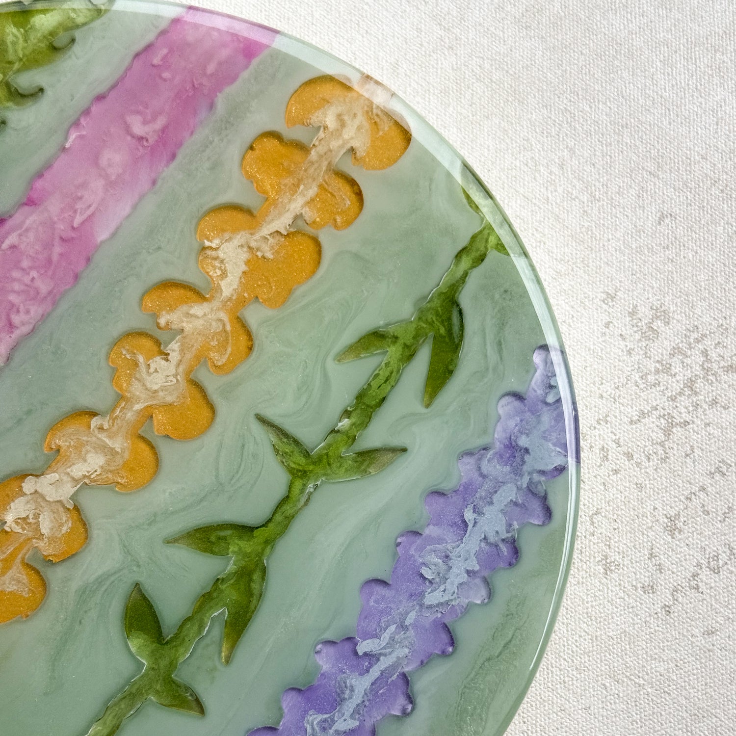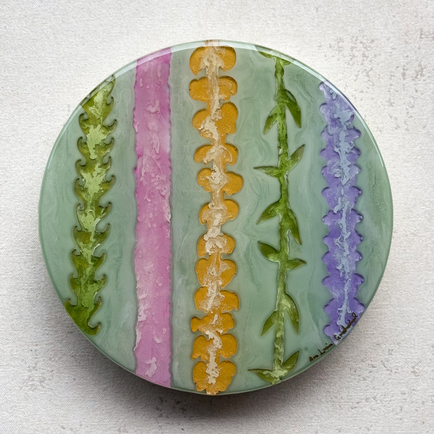 Ana Lucia poured resin coats with pure pigments to cover the piece and try to capture the fluid movements of the vibrant colors within the flowers. Each flower is uniquely detailed with acrylic paint. The colorful strokes of paint give a different essence to each flower.