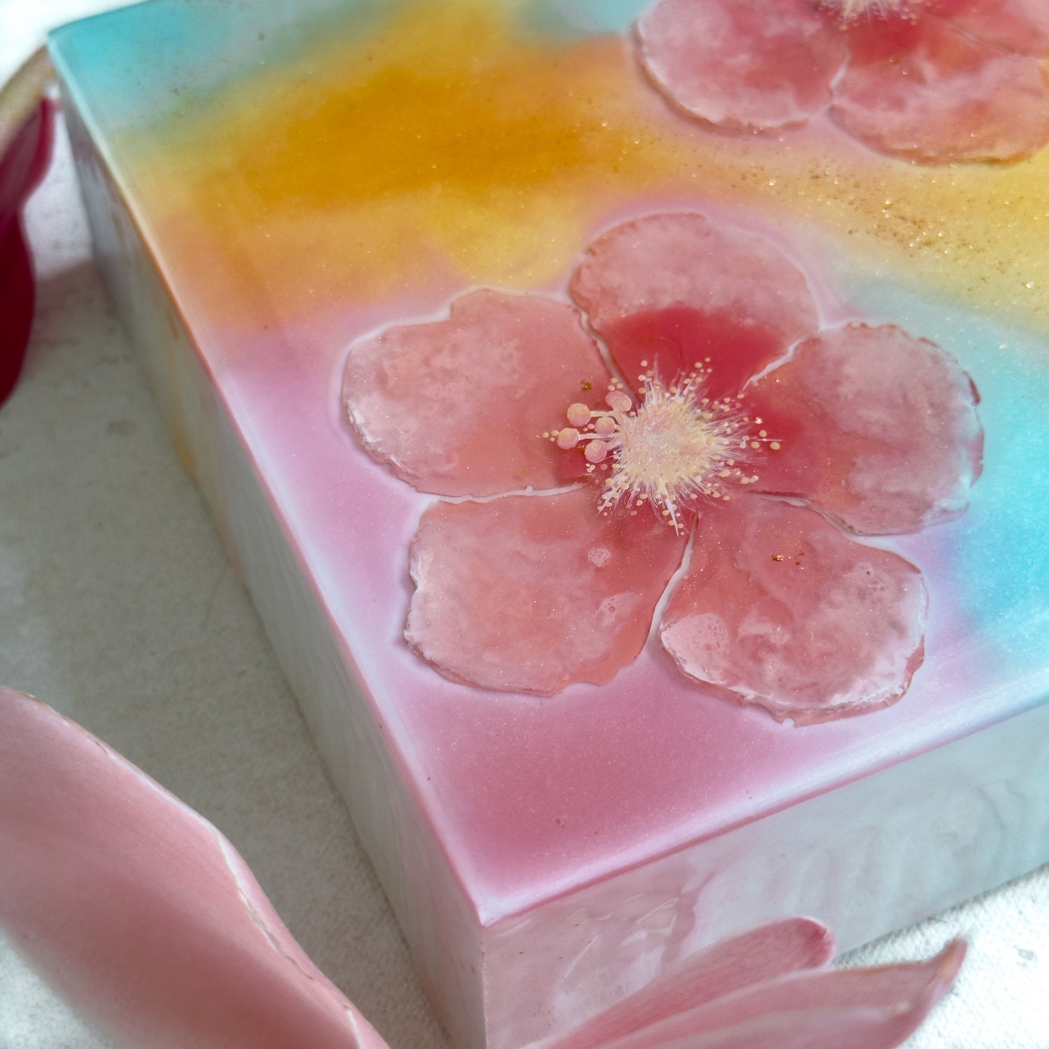 Ana Lucia poured resin coats with pure pigments to cover the piece and try to capture the fluid movements of the vibrant colors within the hibiscus. Each flower is uniquely detailed with acrylic paint. The colorful strokes of paint give a different essence to each flower.